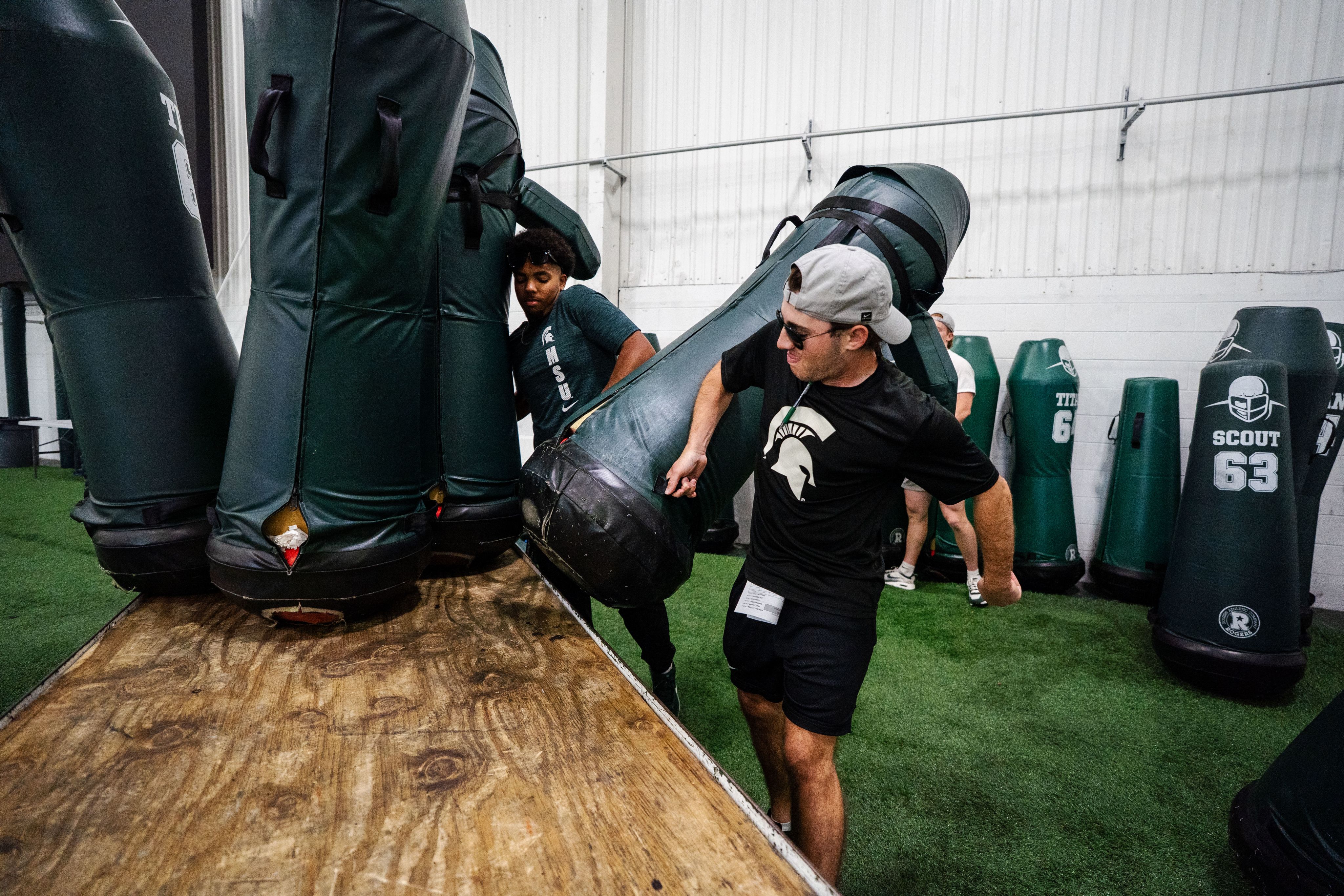 Student equipment managers Matt Bove and Dionte Harris load the cart with tackling dummies during practice at the Duffy Daugherty Building on Sept. 15, 2025.