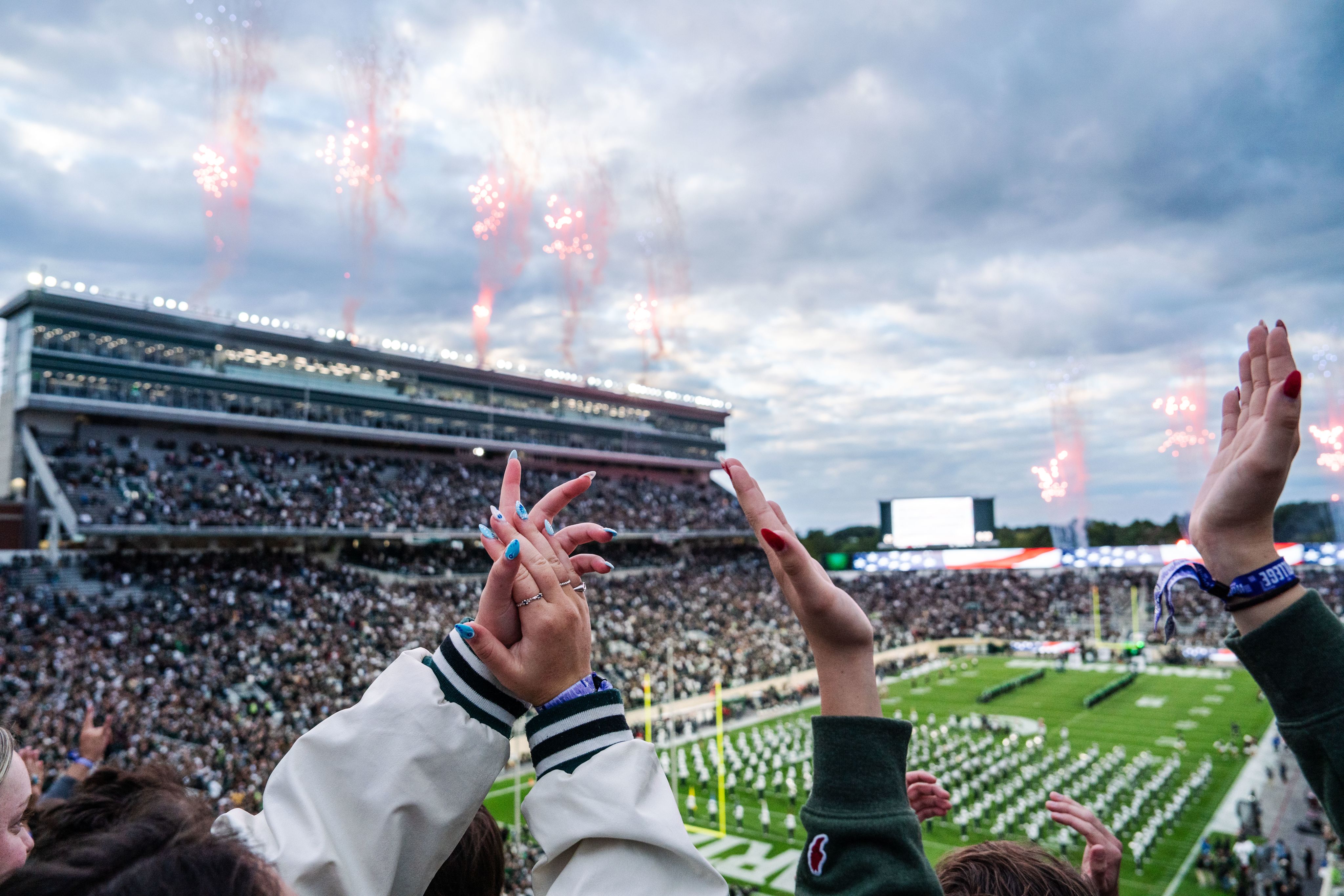 Michigan State student section celebrates after scoring the first touchdown of the season against Western Michigan at Spartan Stadium on Aug. 29, 2025.