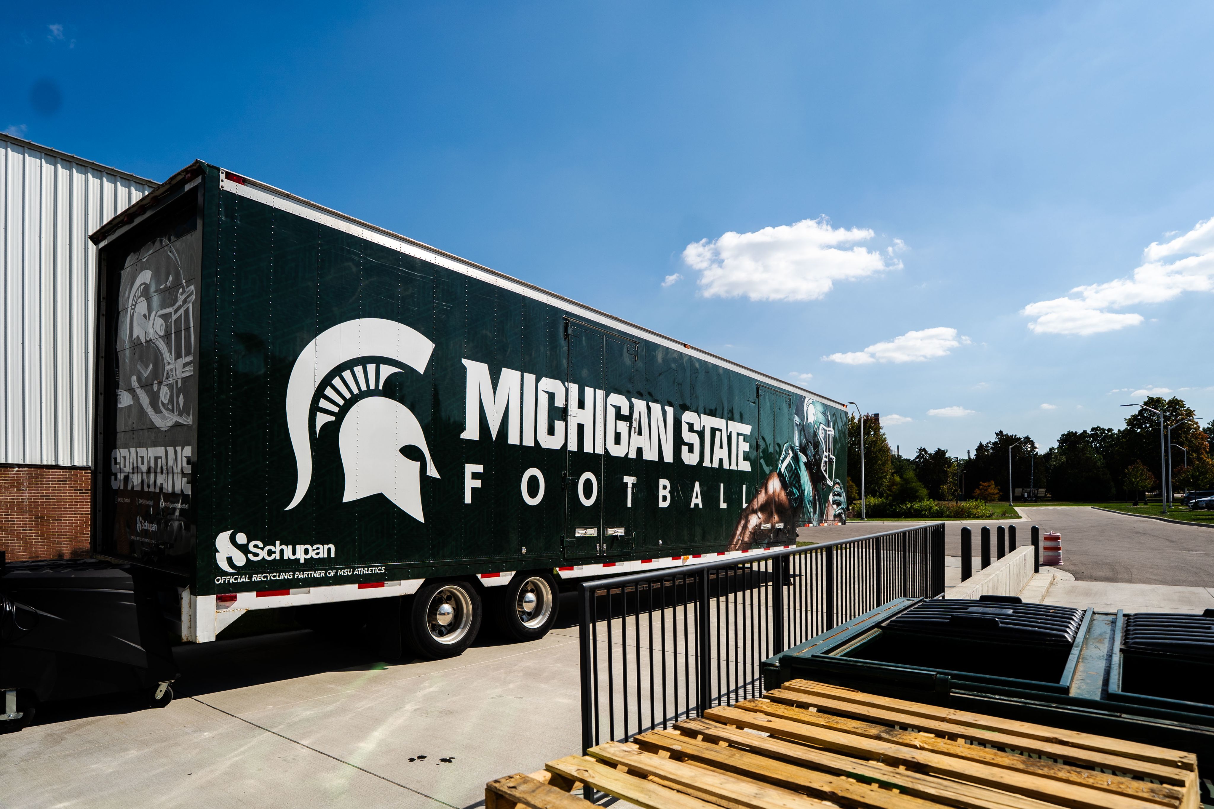 The Michigan State Football equipment truck sits loaded outside the football building before their upcoming game against USC on Sept. 15, 2025.