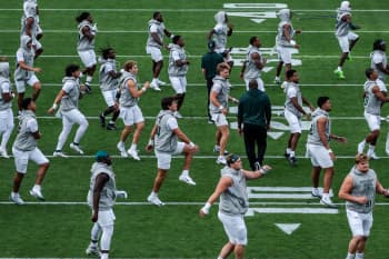 Student equipment manager Marek Beckering puts guardian caps on defensive line helmets before practice. Guardian caps are soft shell helmet covers designed to reduce head impact during practice and are required by the NCAA during certain preseason and contact periods to help limit the risk of head injuries.