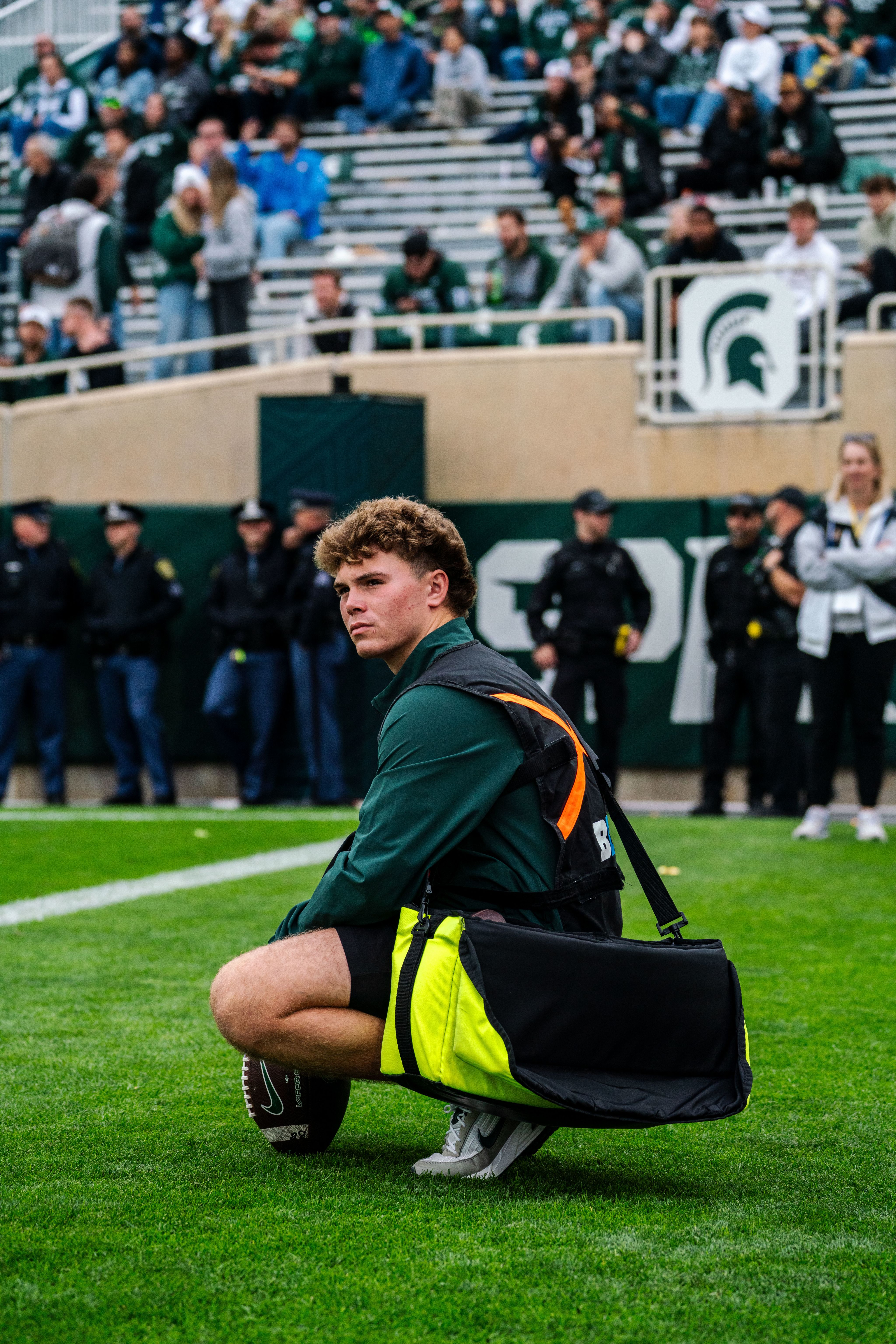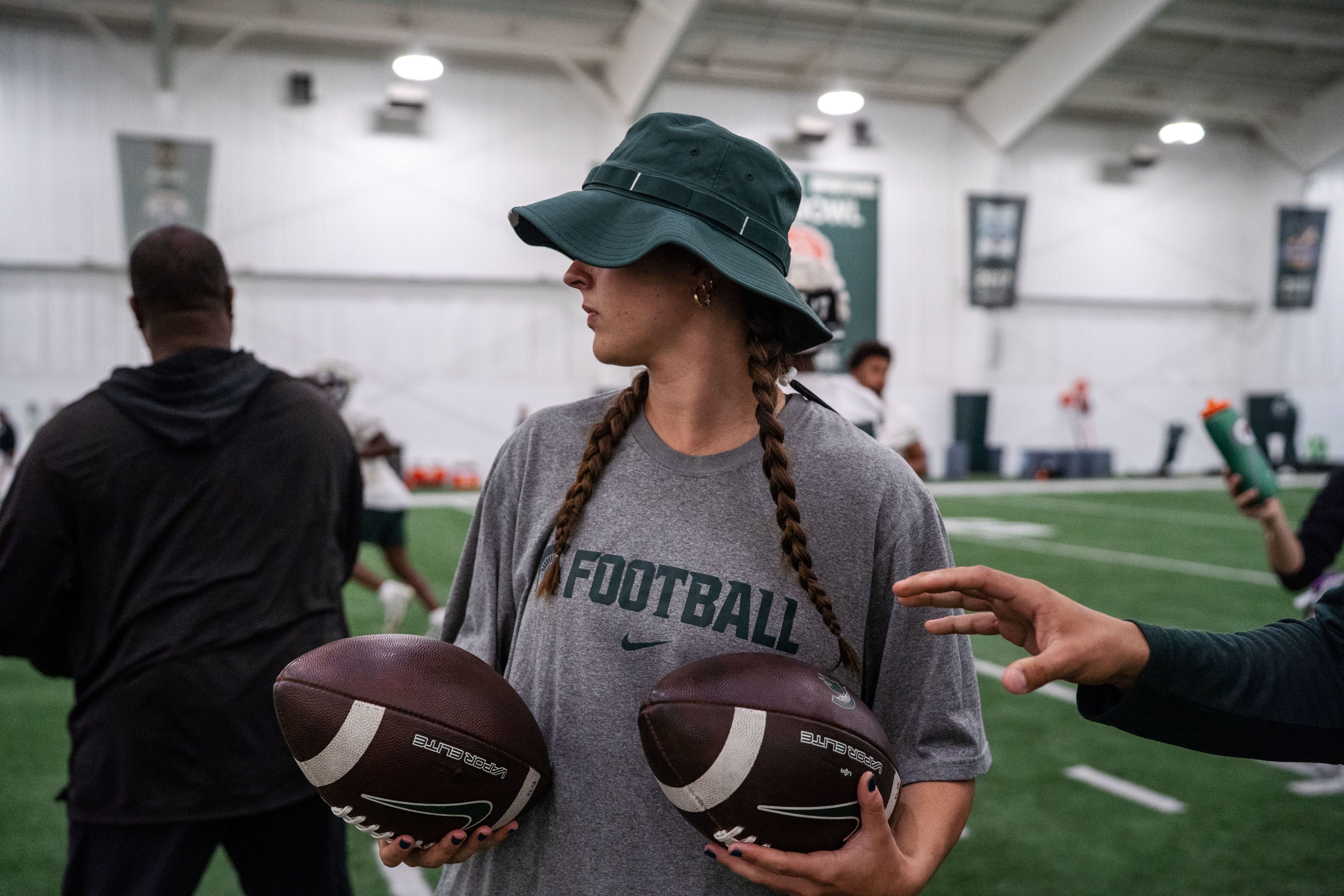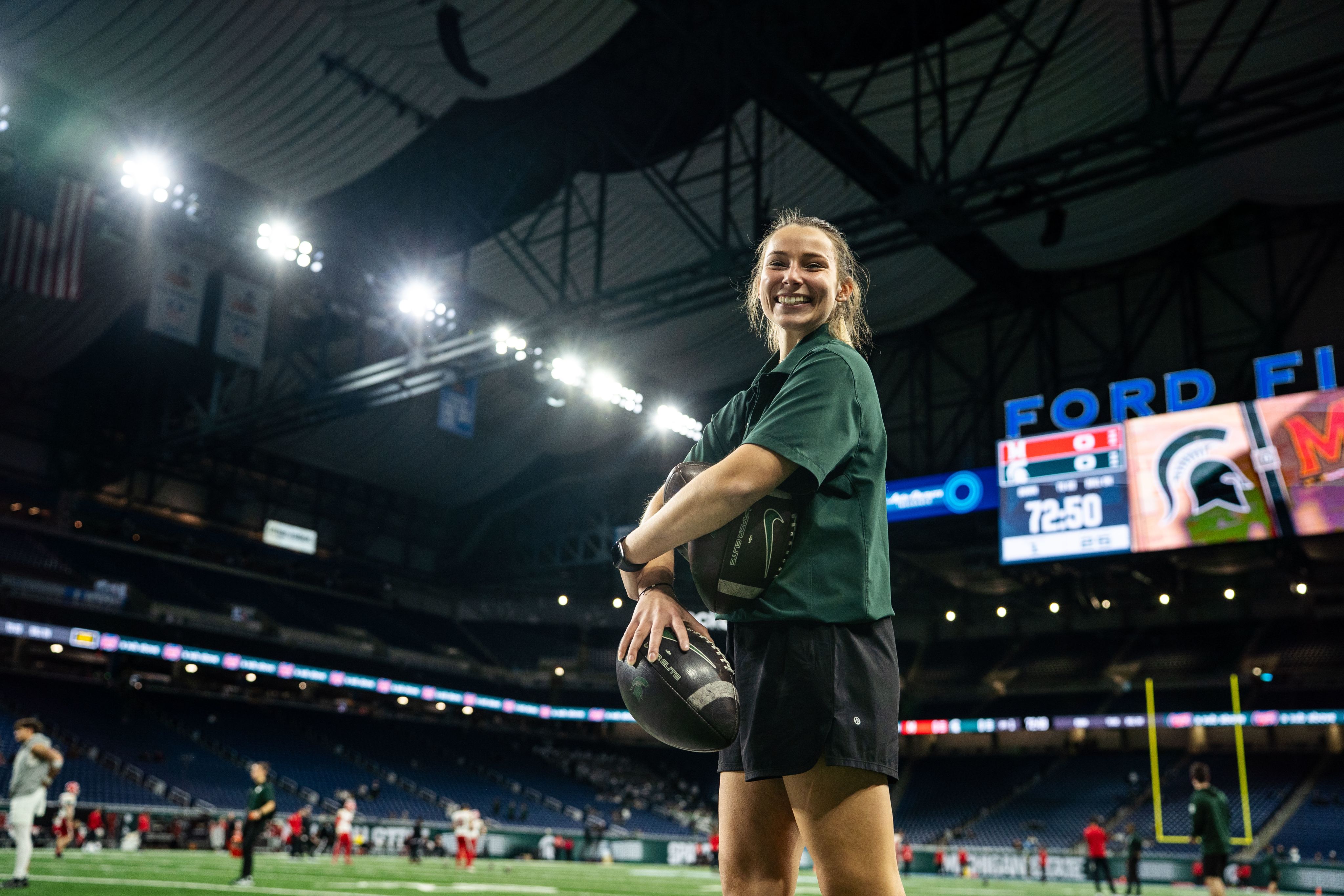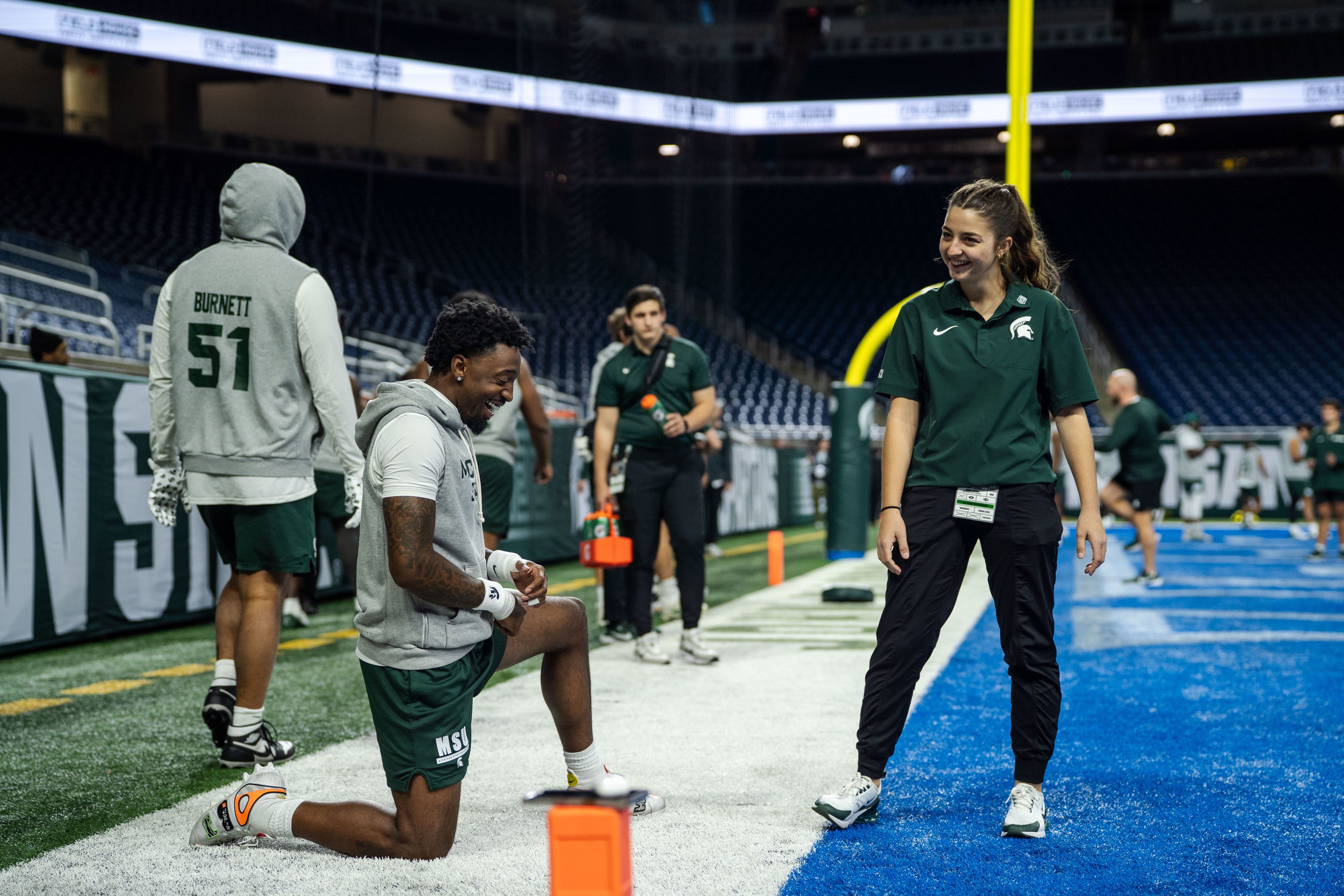 Colby no longer watches from the stands, but from the sidelines, where she helps manage equipment for the team's Tight Ends and Special Teams. She is one part of a multifaceted operation that makes those moments possible for other MSU fans.