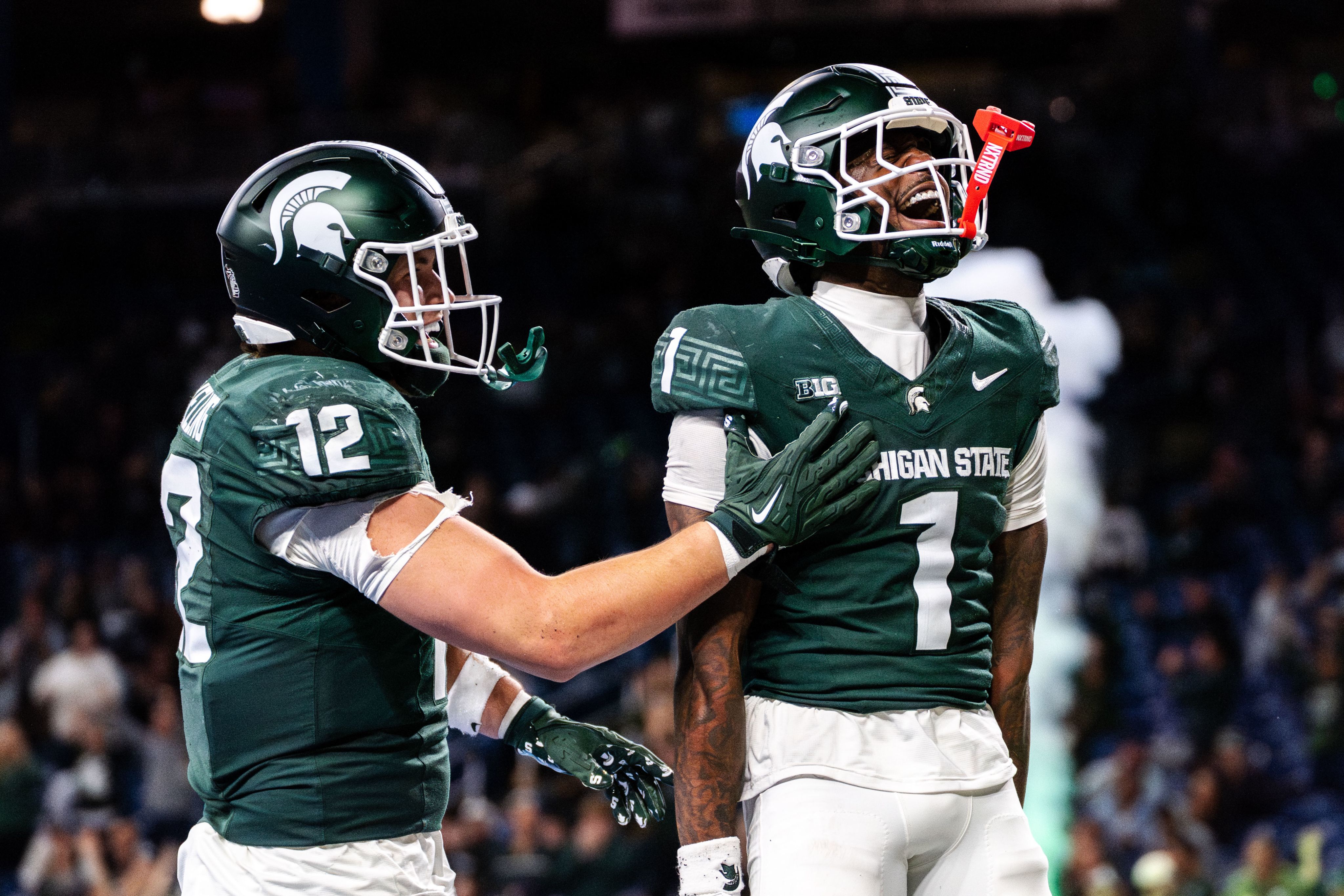 Michigan State wide receiver Omari Kelly (1) celebrates his only touchdown of the game with tight end Jack Veiling (12) against the University of Maryland at Ford Field in Detroit on Nov. 29, 2025. Michigan State beat Maryland 38–28 to finish the season 4–8.