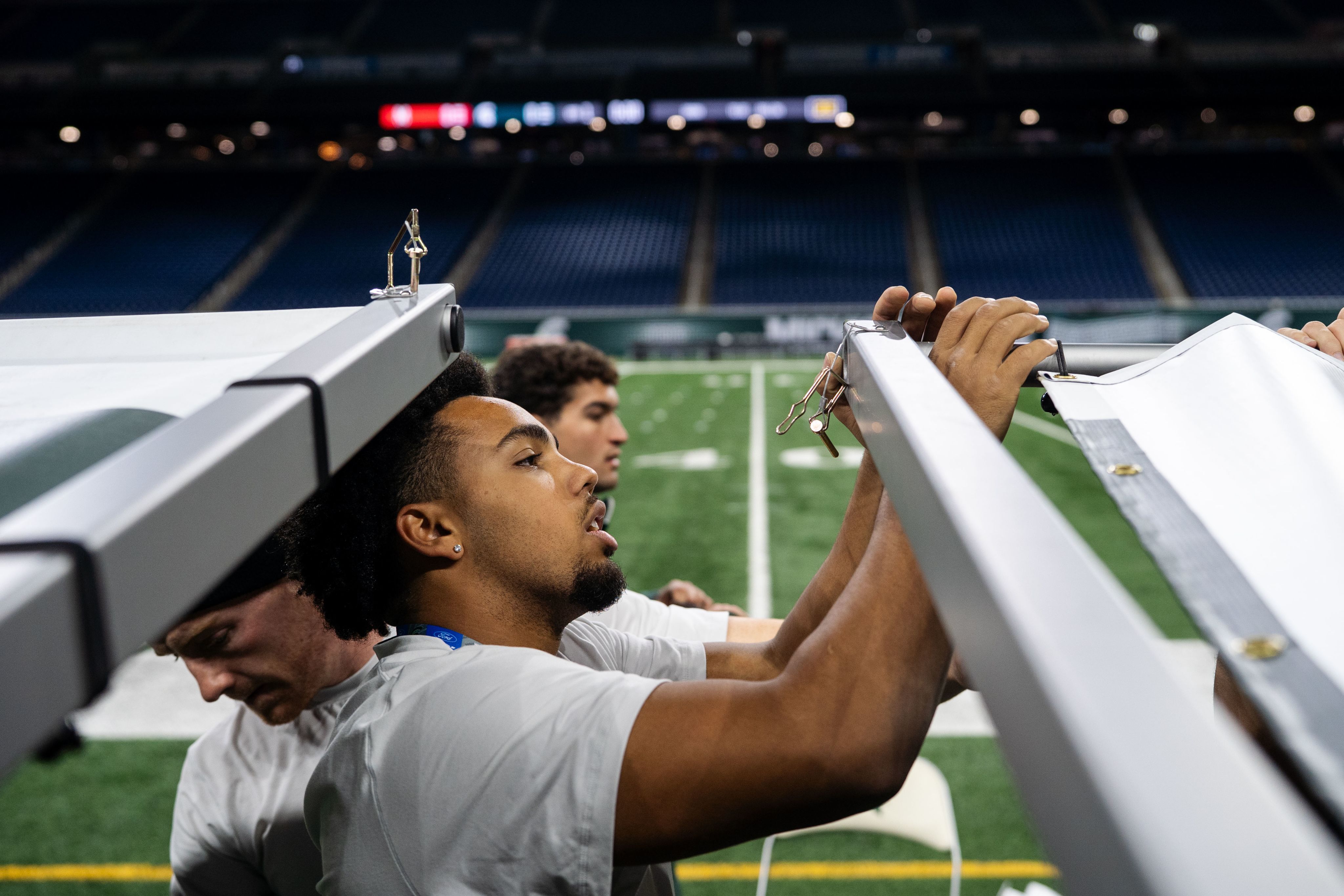 “They not only just drive right from here to the stadium,” Kolpacki said. “They meet us at the hotel. We do unloading at the hotel. Then they go from the hotel to the stadium after that.” The goal is consistency. Meetings, walkthroughs, and routines are designed to feel identical to home, even when they are built inside unfamiliar walls.