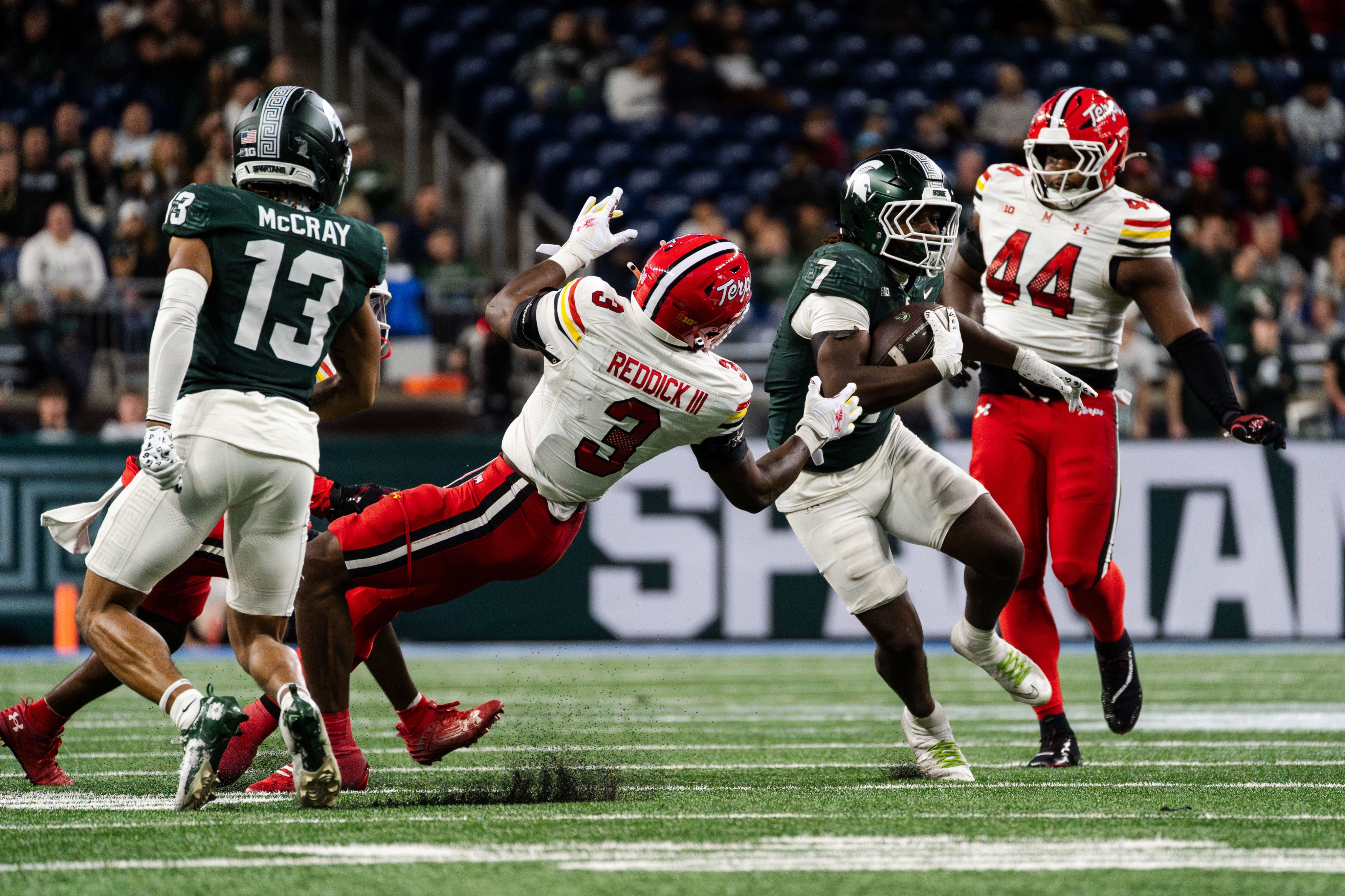 Michigan State running back Brandon Tullis (7) runs past Maryland linebacker Trey Reddick III (3) during their game at Ford Field on Nov. 29, 2025.