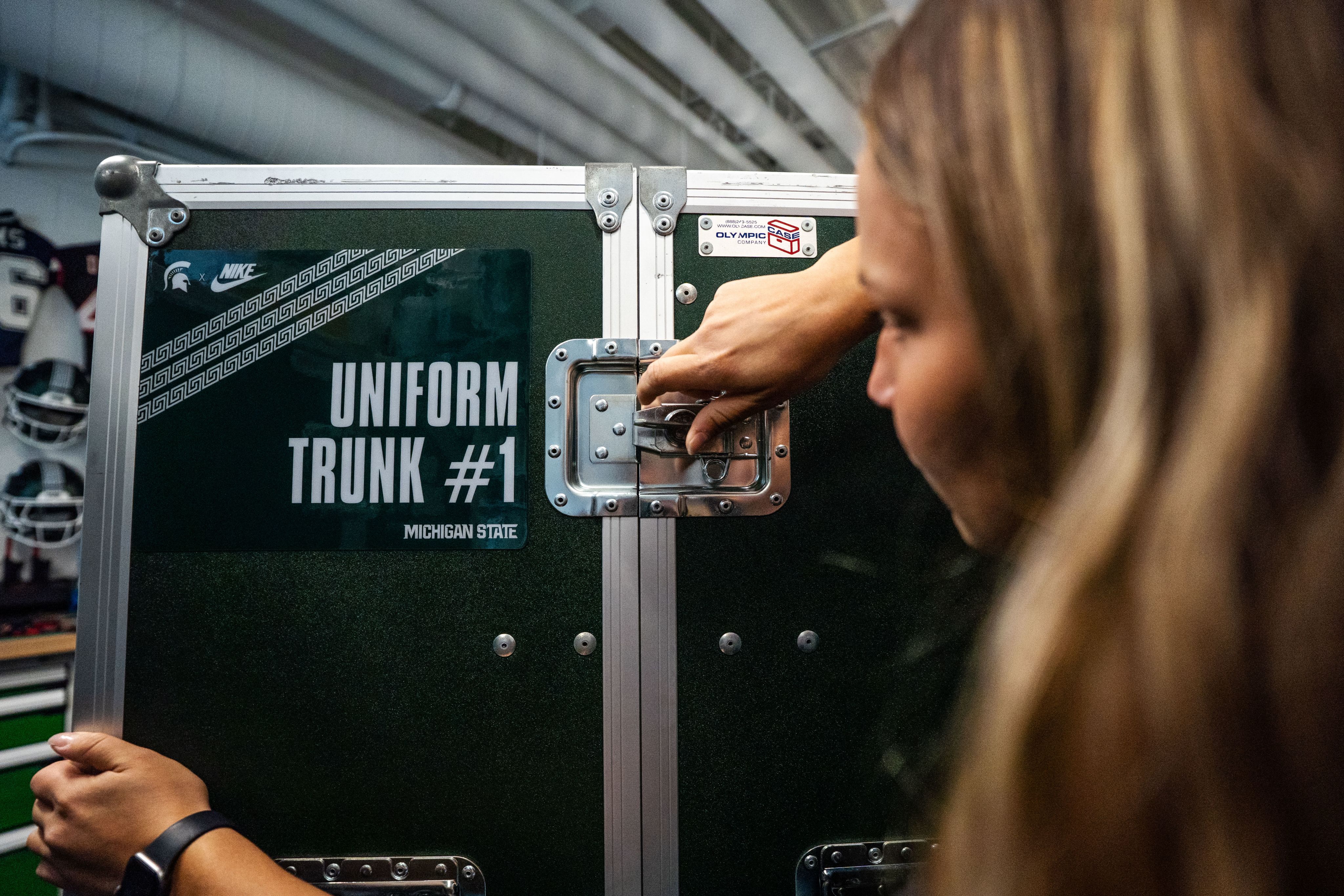 Emma Colby seals one of the uniform trunks for Michigan State’s game against USC in the equipment room on Sept. 15, 2025.