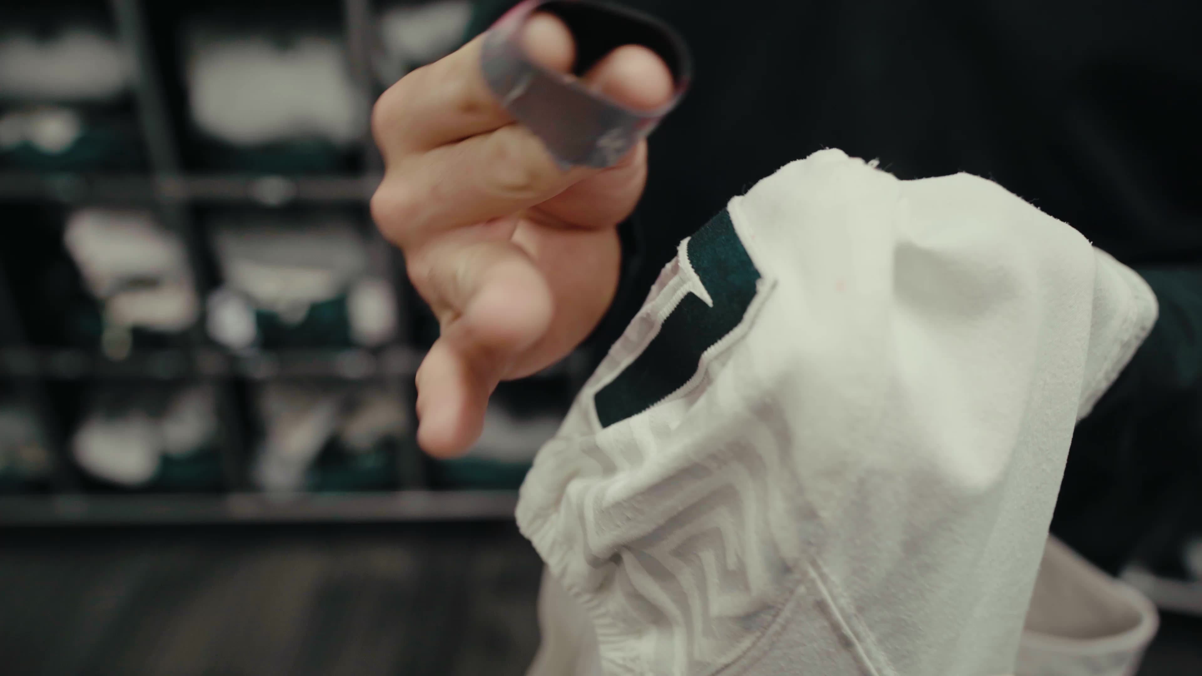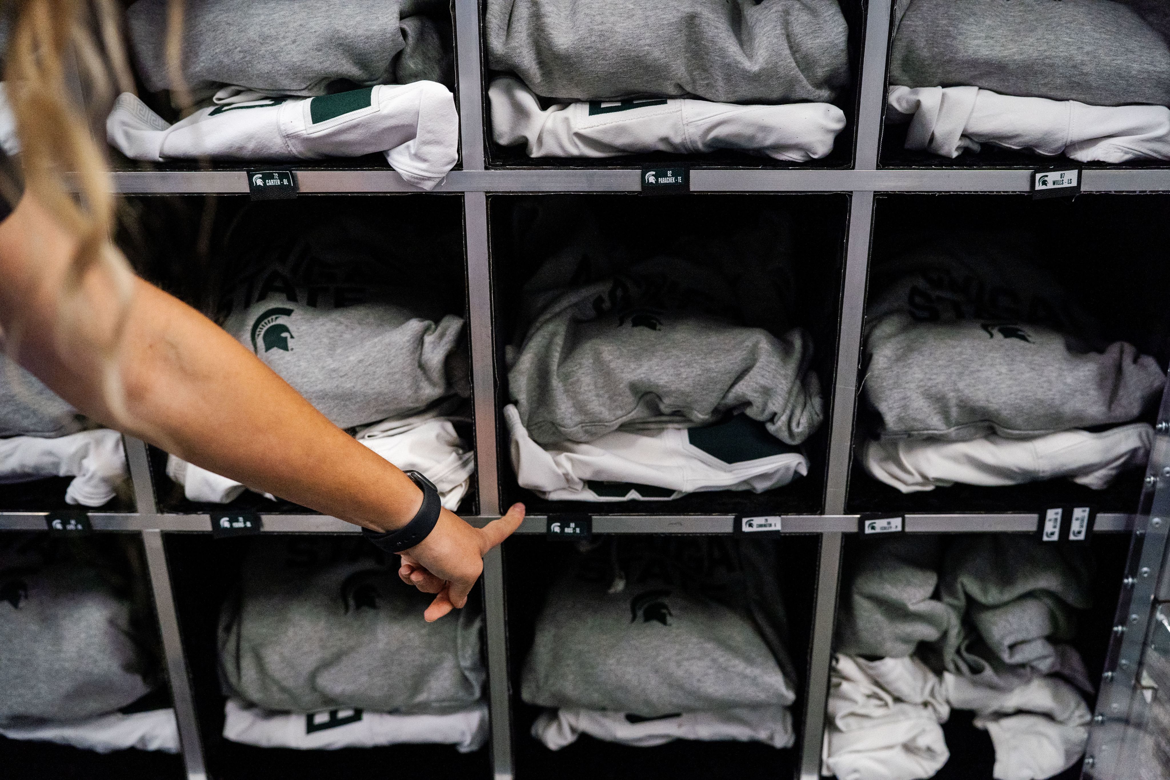 Emma Colby, sorts pregame uniform loops while preparing for Michigan State’s trip to USC on Sept. 15, 2025. She places each piece of clothing on players’ loops, tracks missing items and organizes them into the proper cubbies.