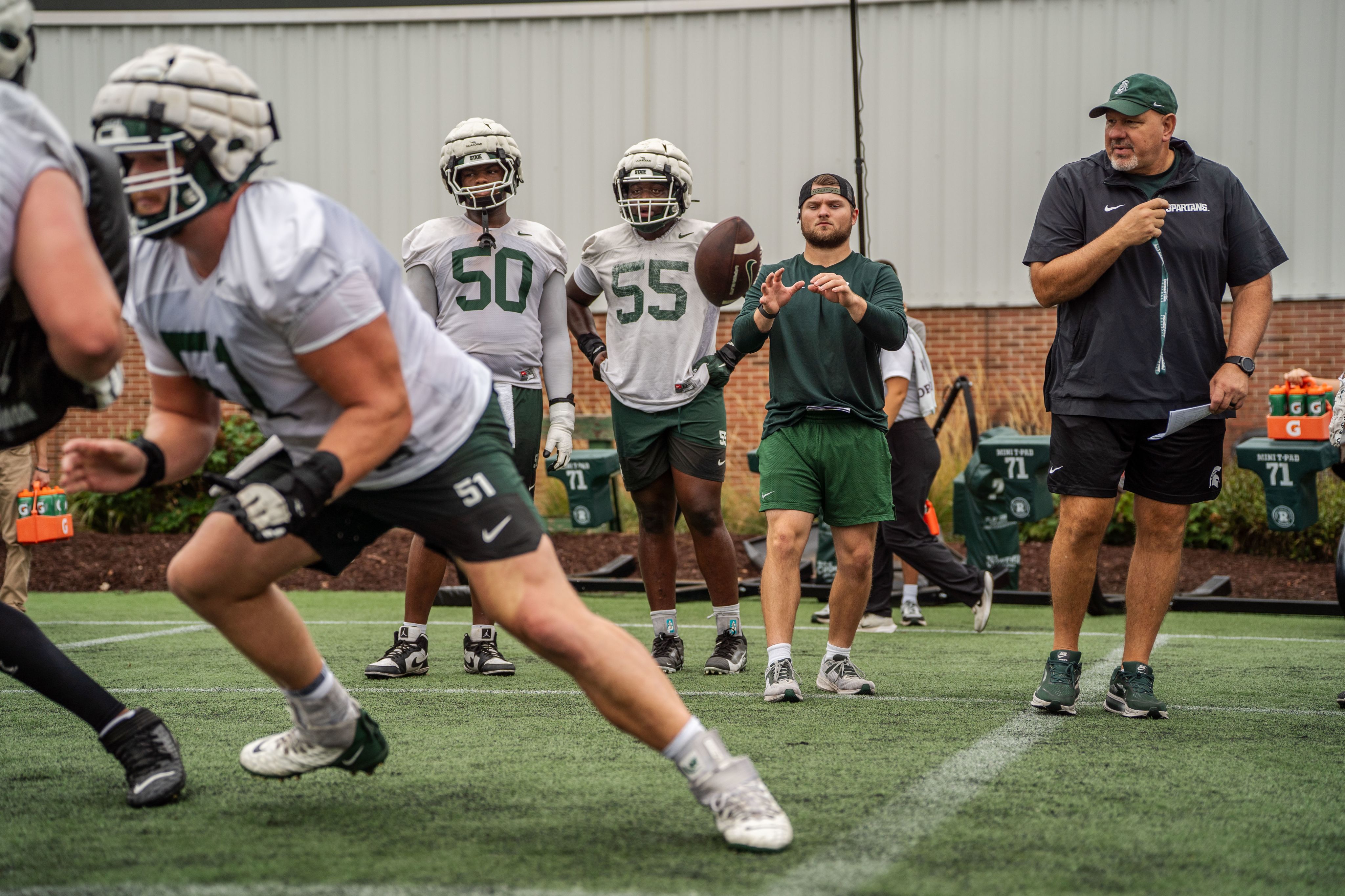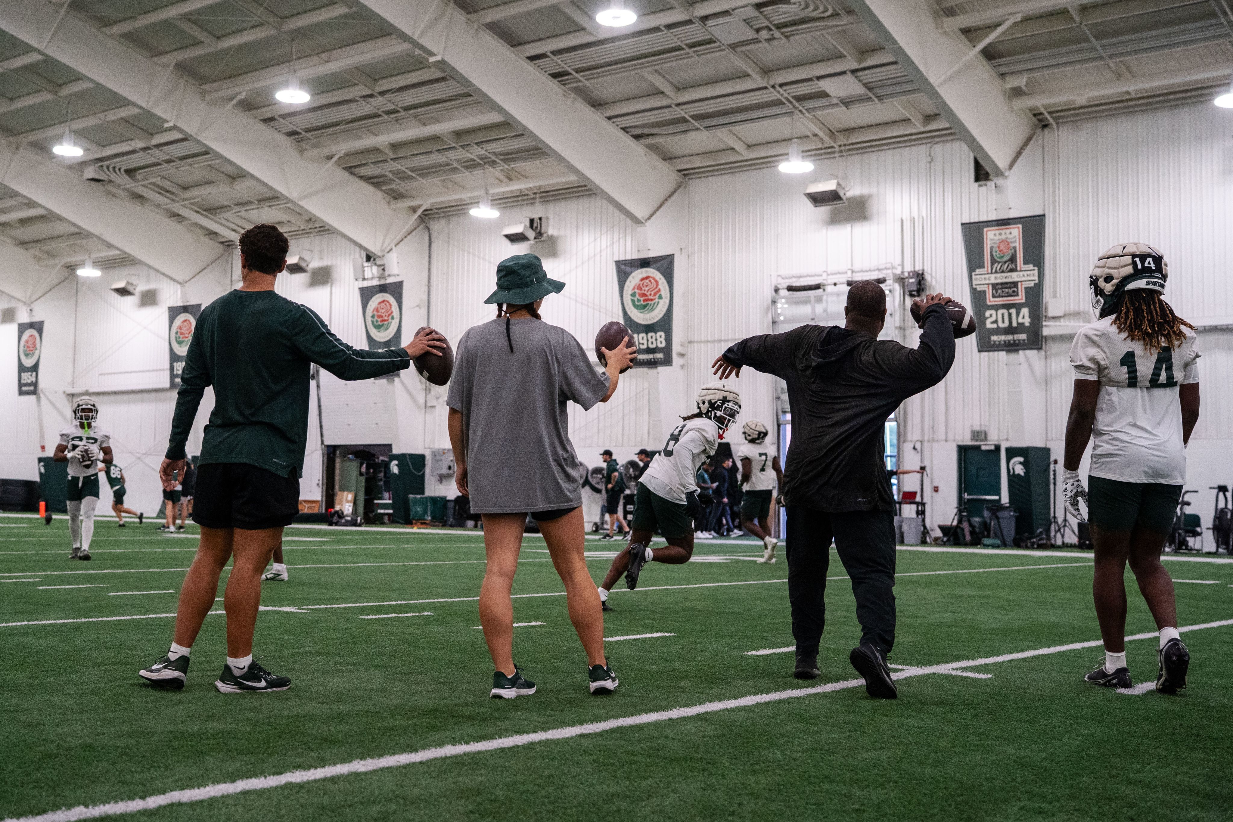 Student equipment manager Jack Fischer and Maggie Kirchmeier help run the running backs practice at the Duffy Daugherty Building on Sept. 24, 2025.