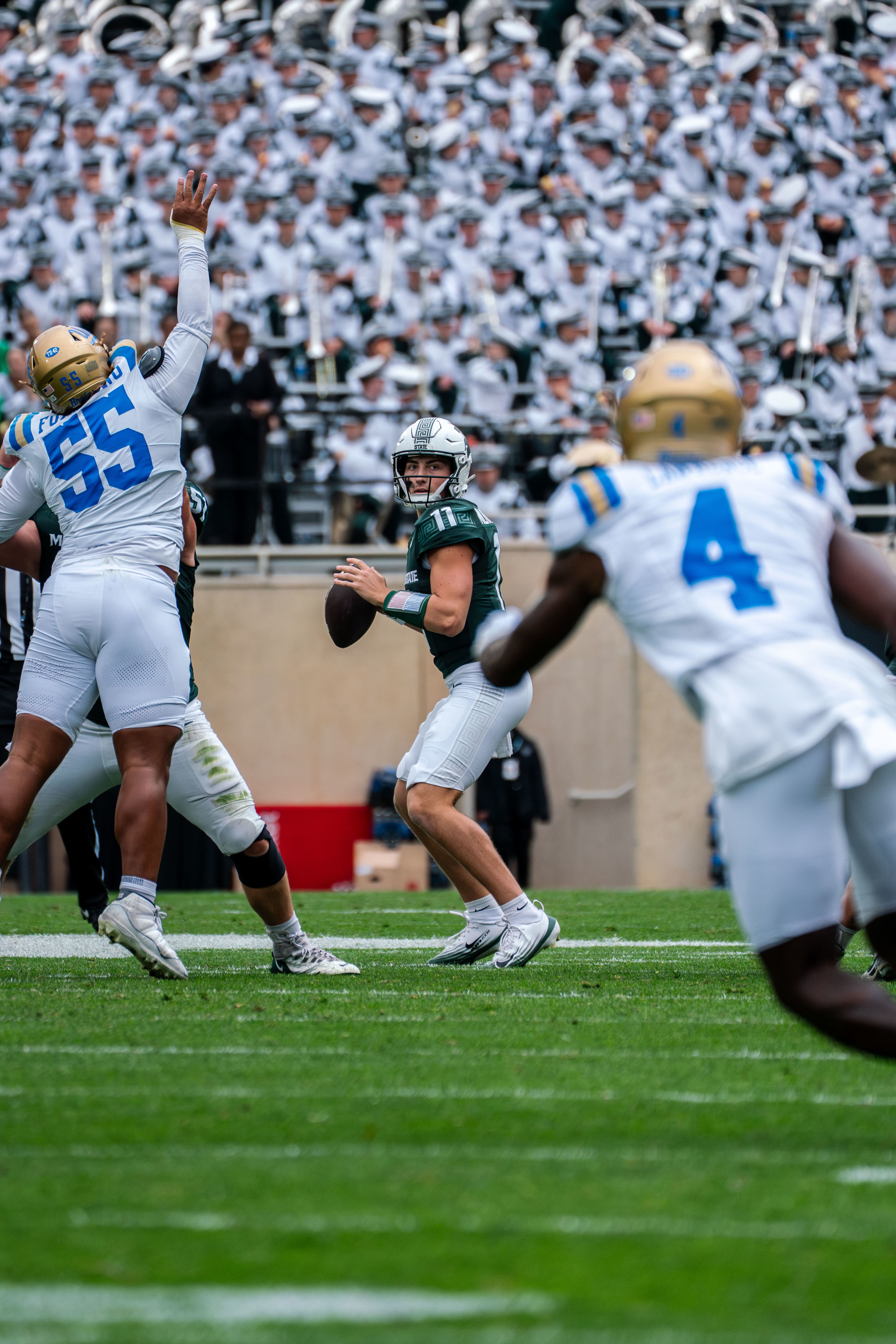Michigan State quarterback Alessio Milivojevic (11) makes his first start of the season against UCLA at Spartan Stadium on Oct. 11, 2025. Michigan State lost 38–13.