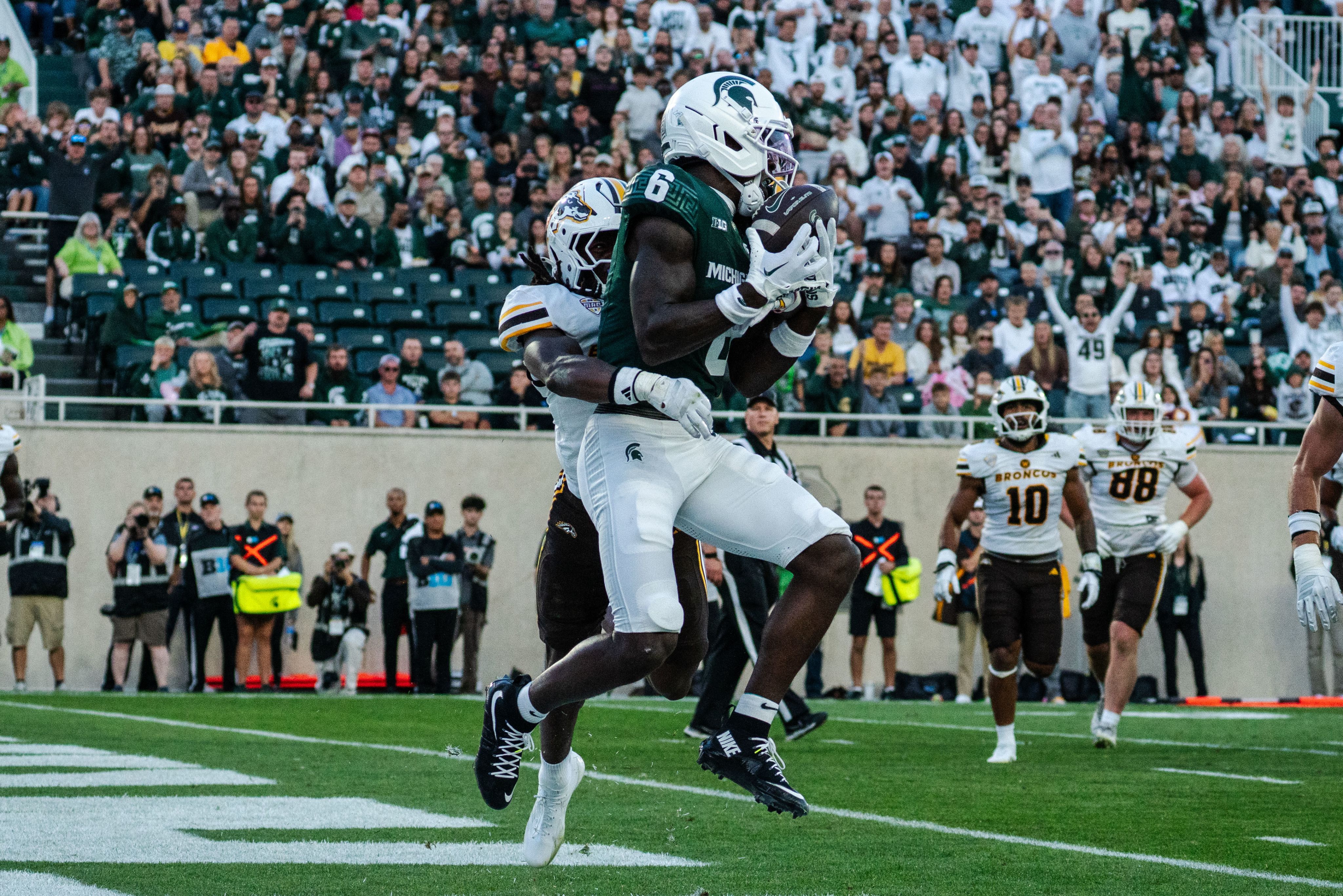 Michigan State wide receiver Nick Marsh catches the first touchdown of the season against Western Michigan at Spartan Stadium on Aug. 29, 2025. Michigan State won 23–6.
