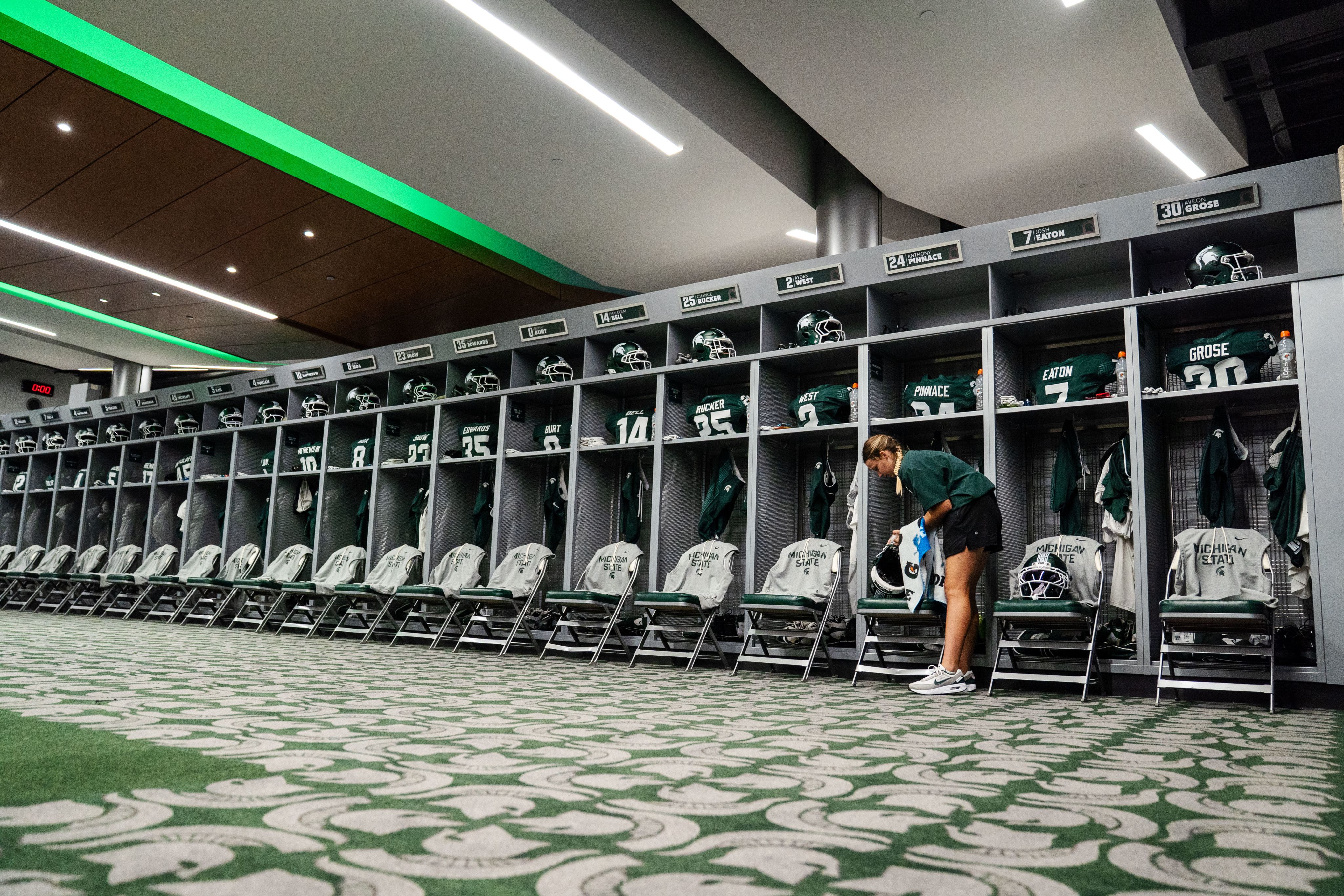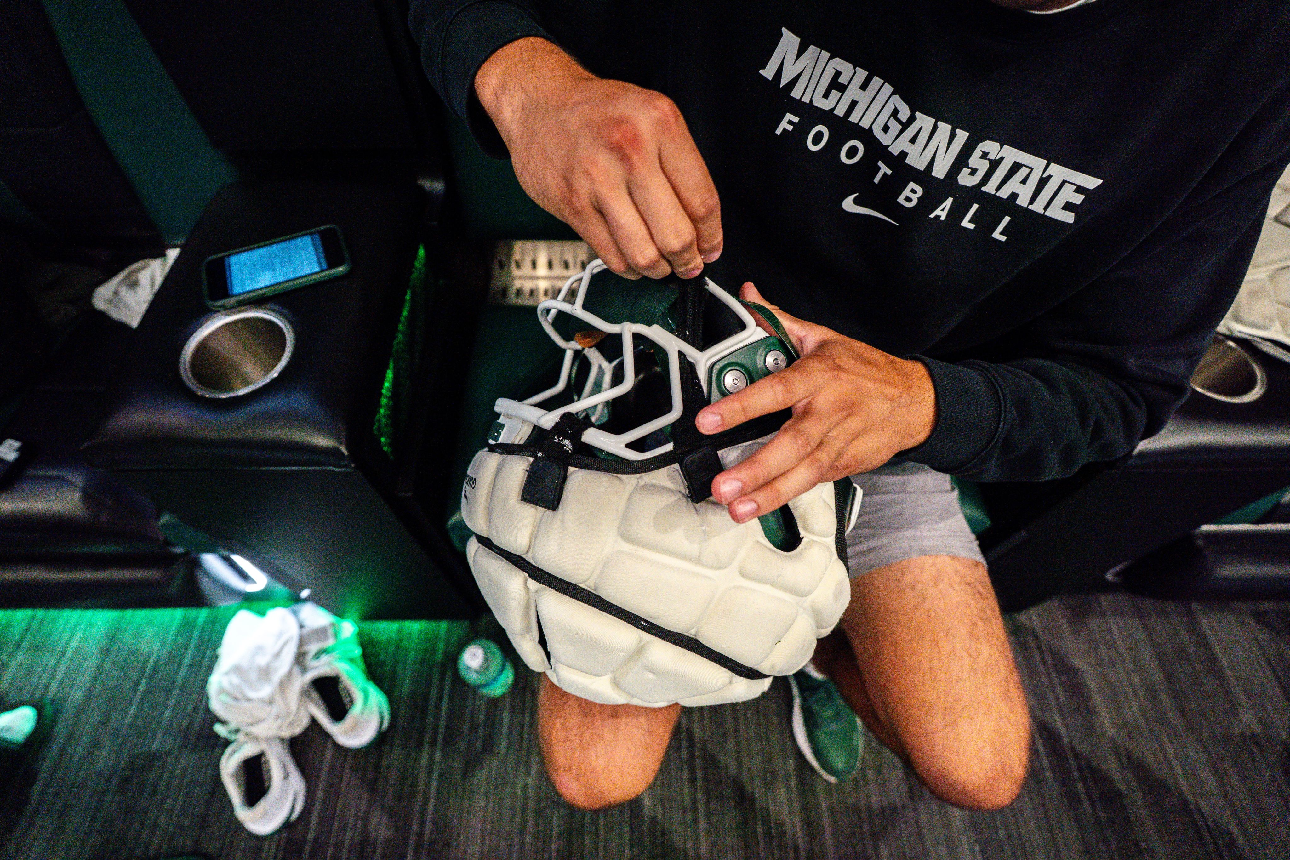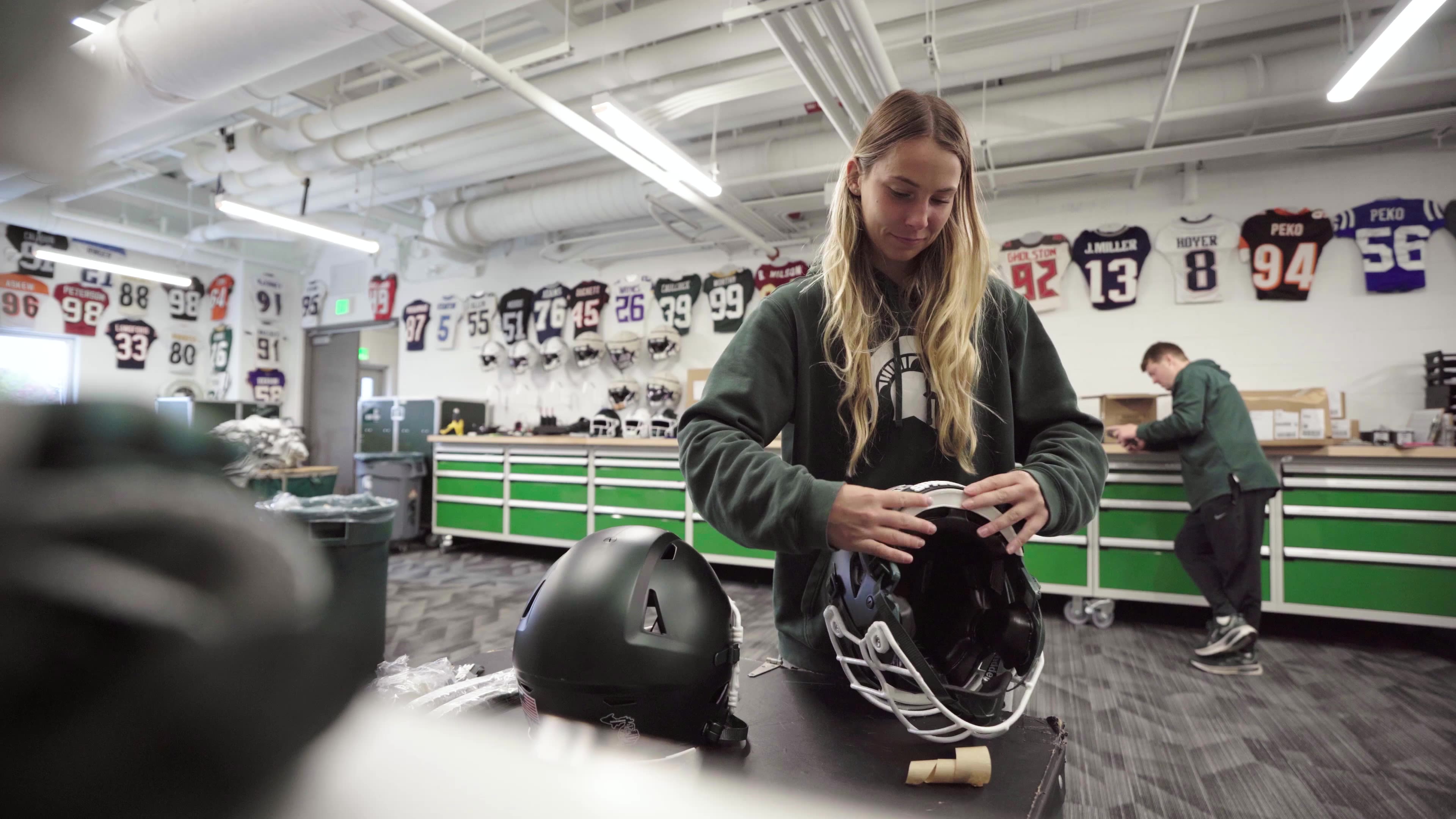 Emma Colby finishes wiping down helmet visors before Michigan State's game against Youngstown State in the Spartan Stadium home locker room on Sept. 13, 2025.