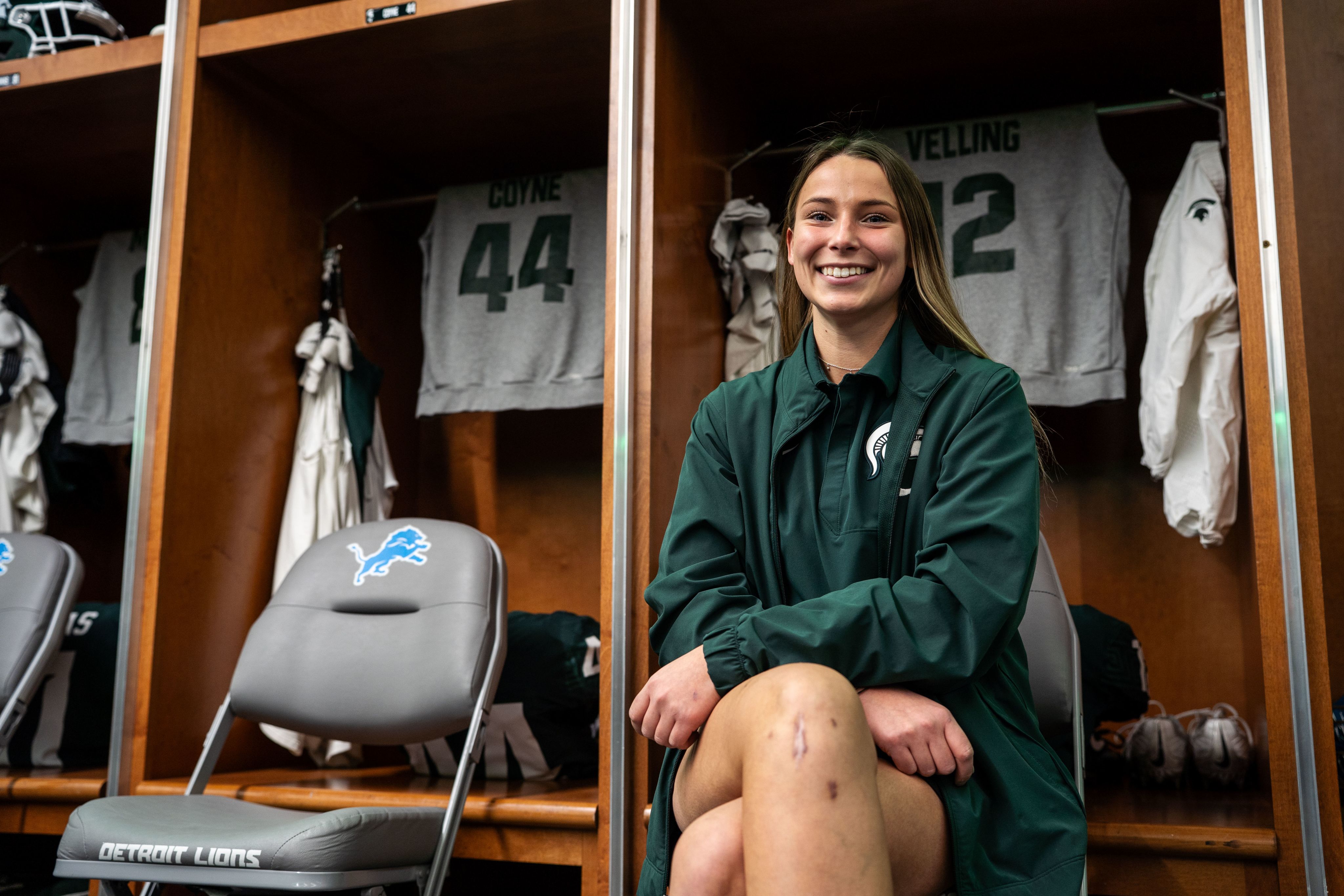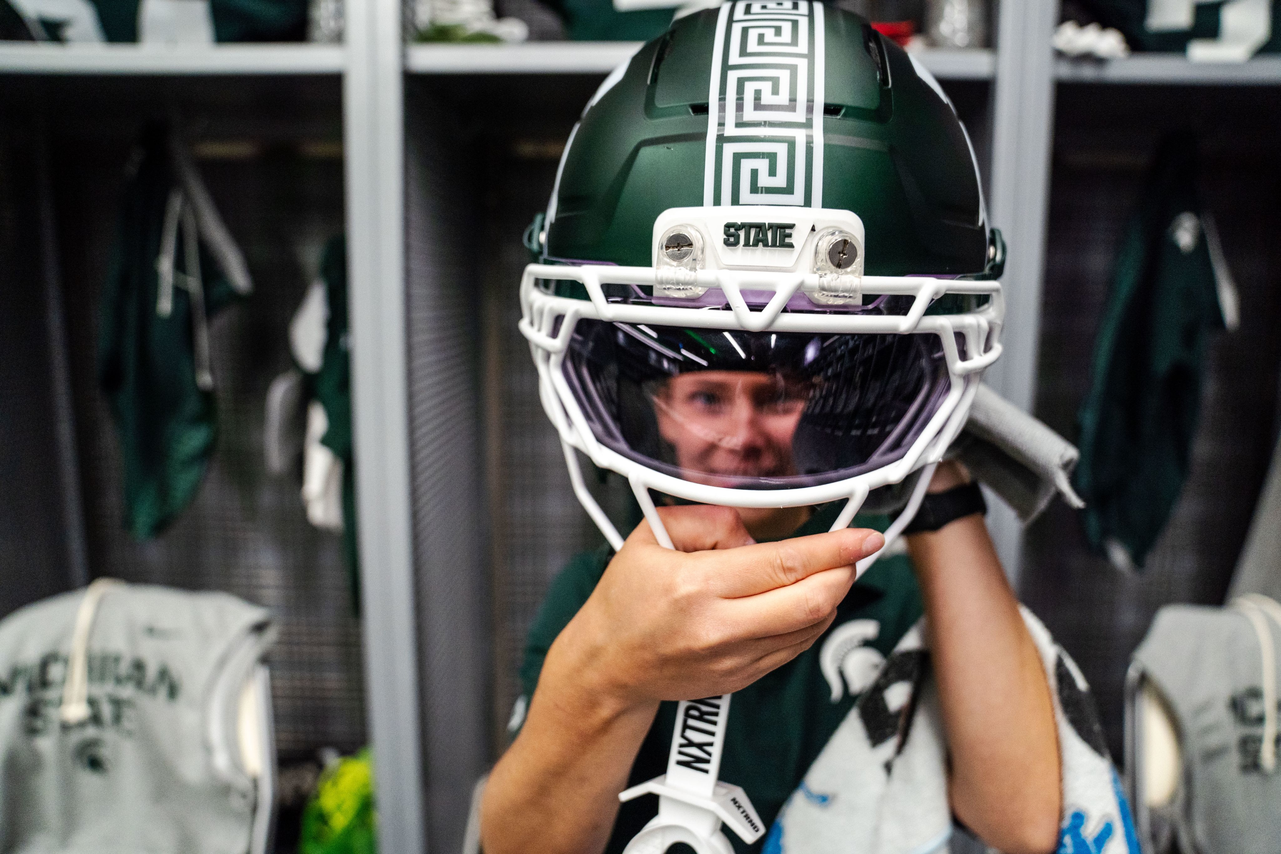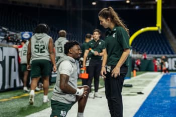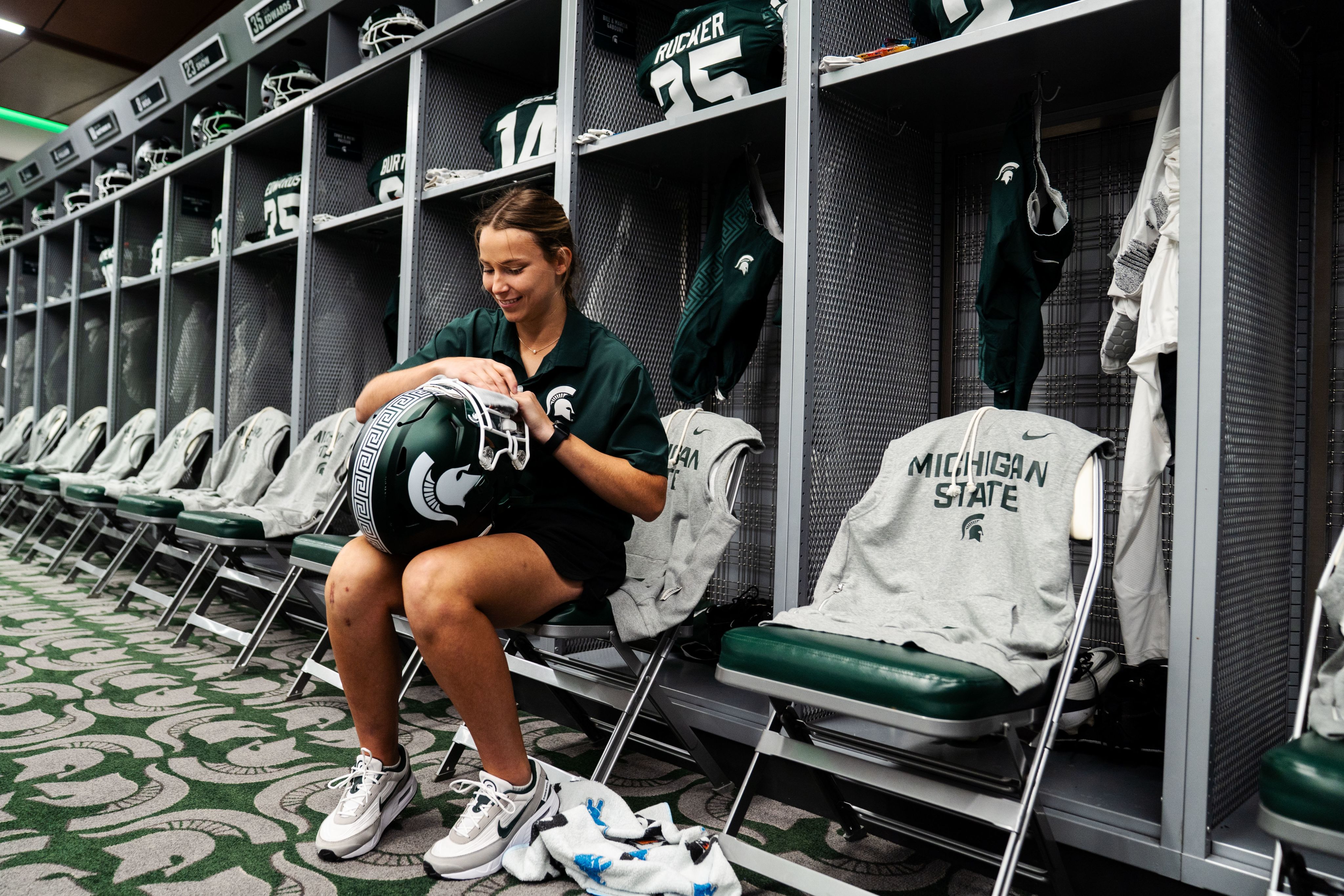 Emma Colby is one of Michigan State University football’s head student equipment managers. She works primarily with the tight ends and special teams, handling everything from helmet preparation and locker room setup to the day-to-day details that keep practices and games running smoothly.