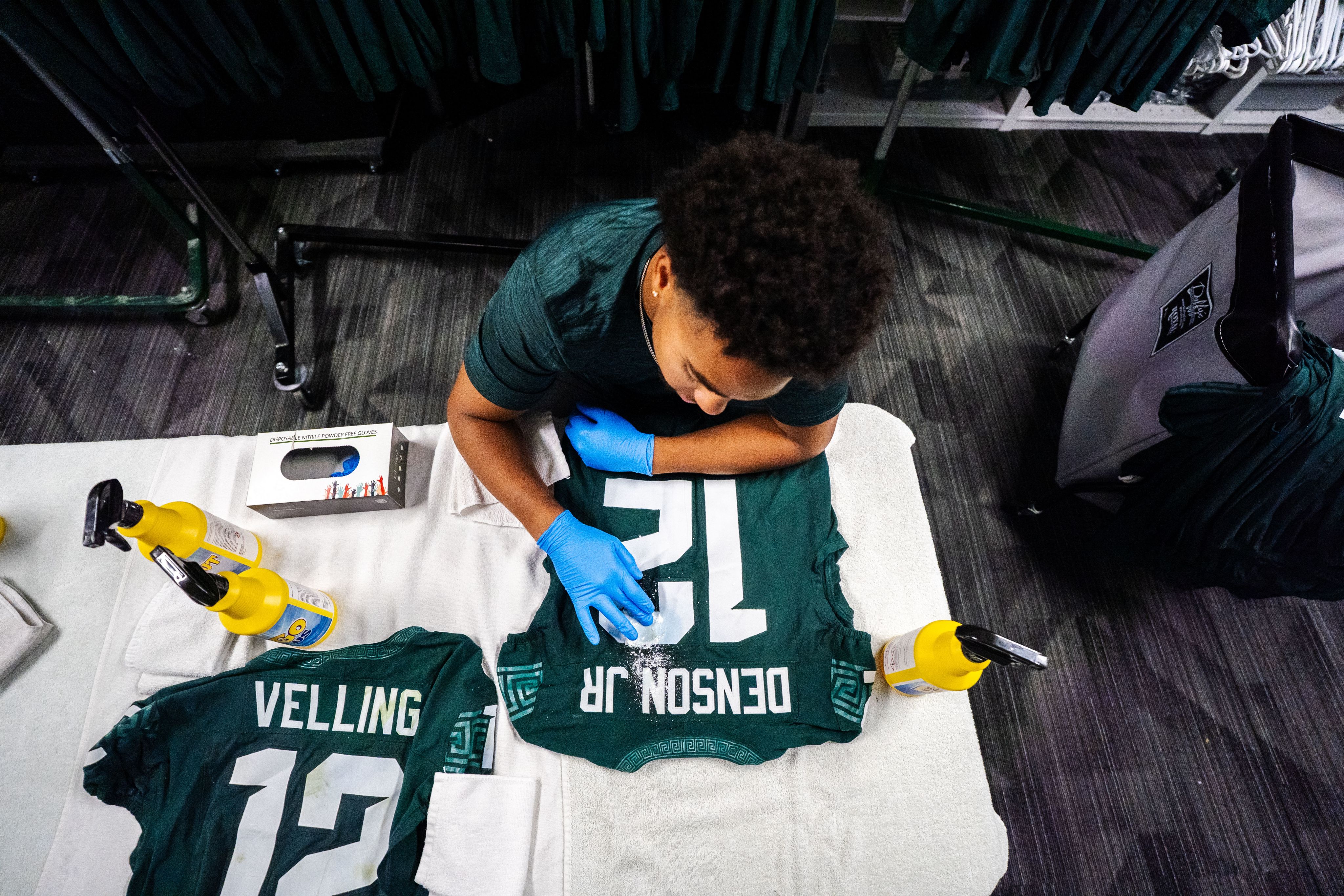 Dionte Harris treats stains on jerseys after a home game against Youngstown State at the Duffy Daugherty Football Building on Sept. 15, 2025.