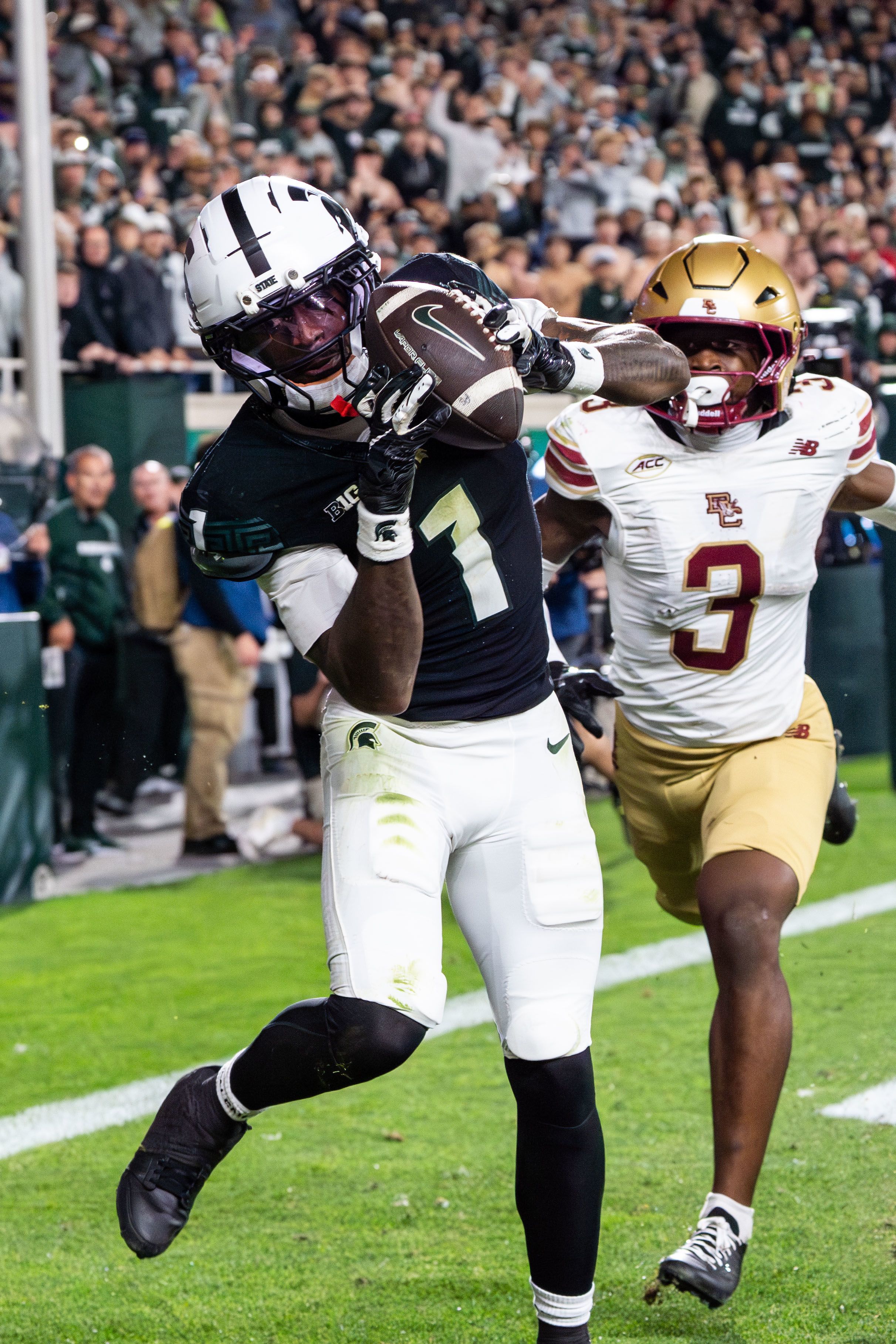 Michigan State wide receiver Omari Kelly (1) catches the game-winning touchdown against Boston College on Sept. 6, 2025. Michigan State beat Boston College 42–40 in double overtime.