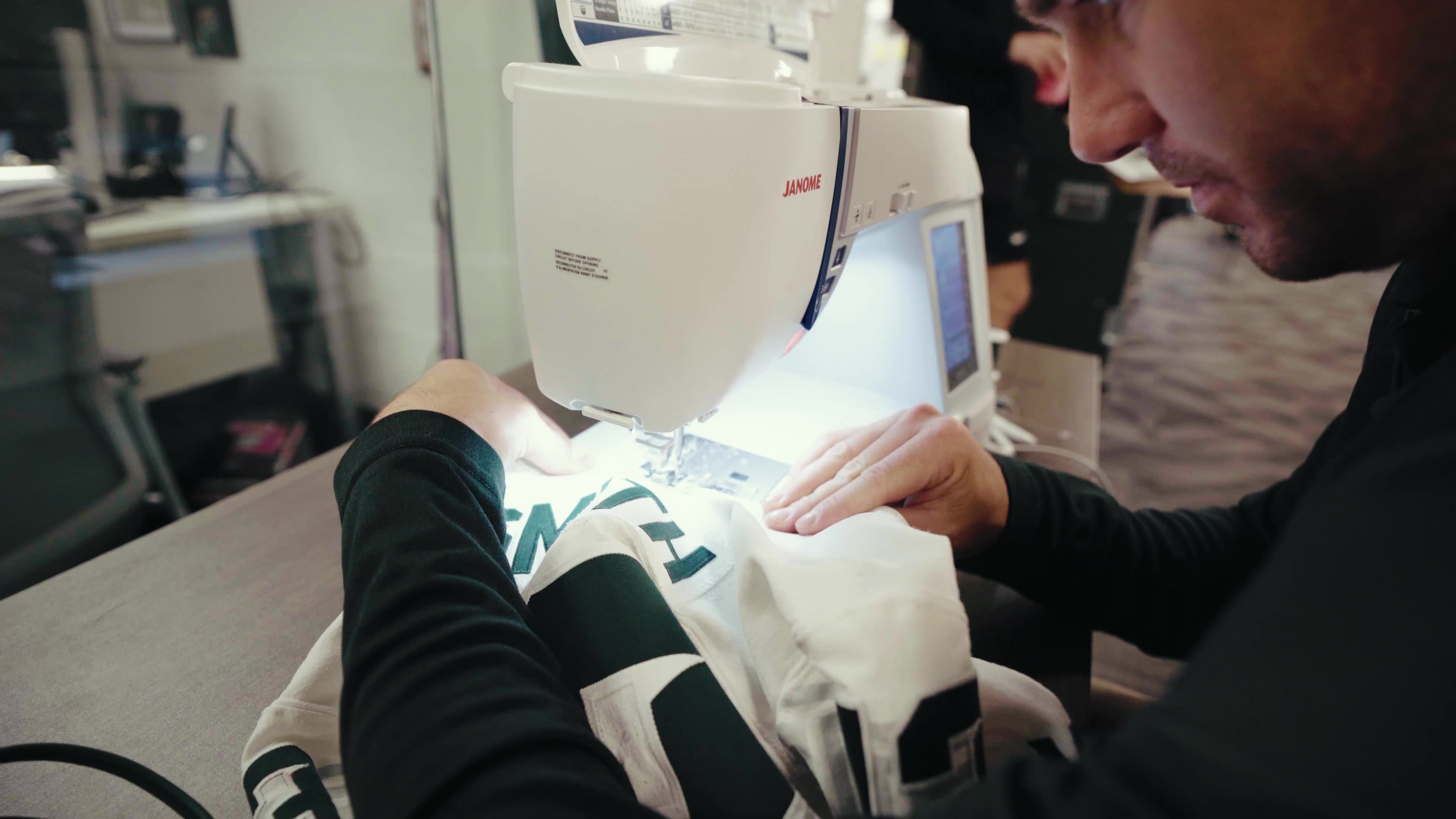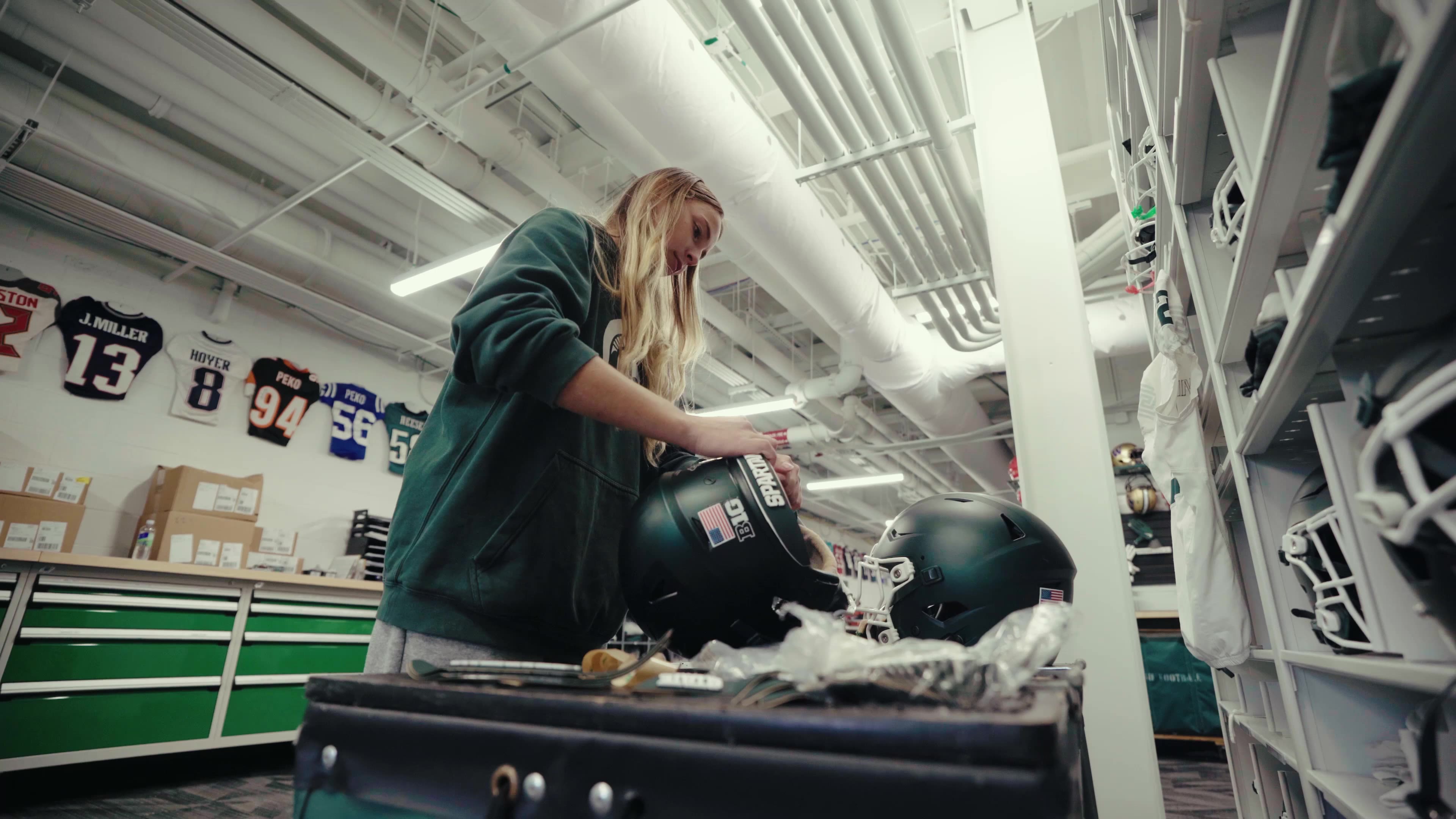 For Colby, helmet work is her favorite part of the job. “I would say for equipment room work, I definitely like working on helmets,” Colby said. “It’s just, it’s like an art. And I can be so precise with it. It takes a little longer to be precise with it, but knowing it’s even on both sides and symmetrical on both sides, and just knowing that that helmet is decaled perfectly.”