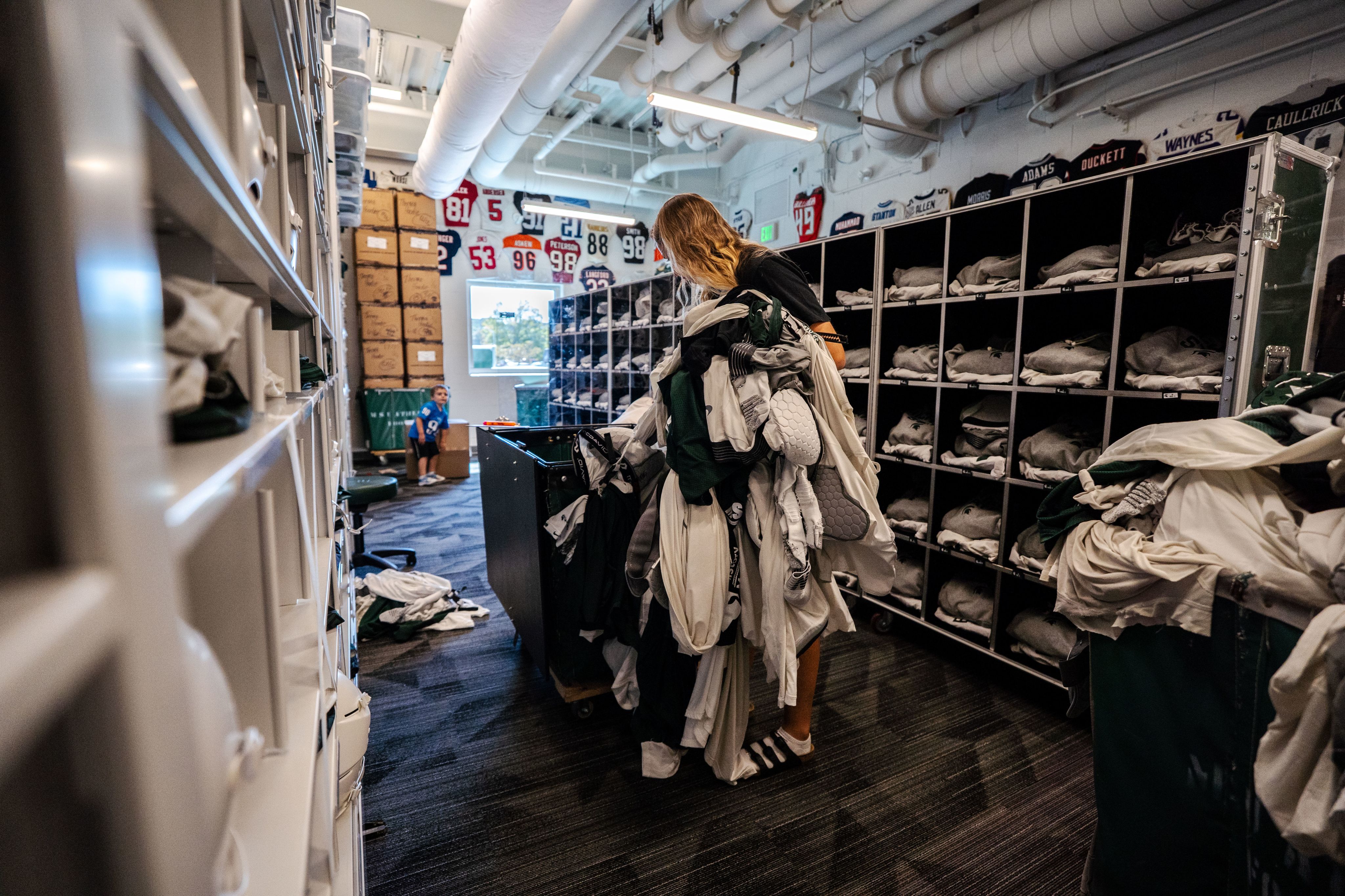 The Michigan State football equipment staff is comprised of 14 student managers and four full-time staff members who support a roster of over 100 athletes throughout practices, travel, and game days.