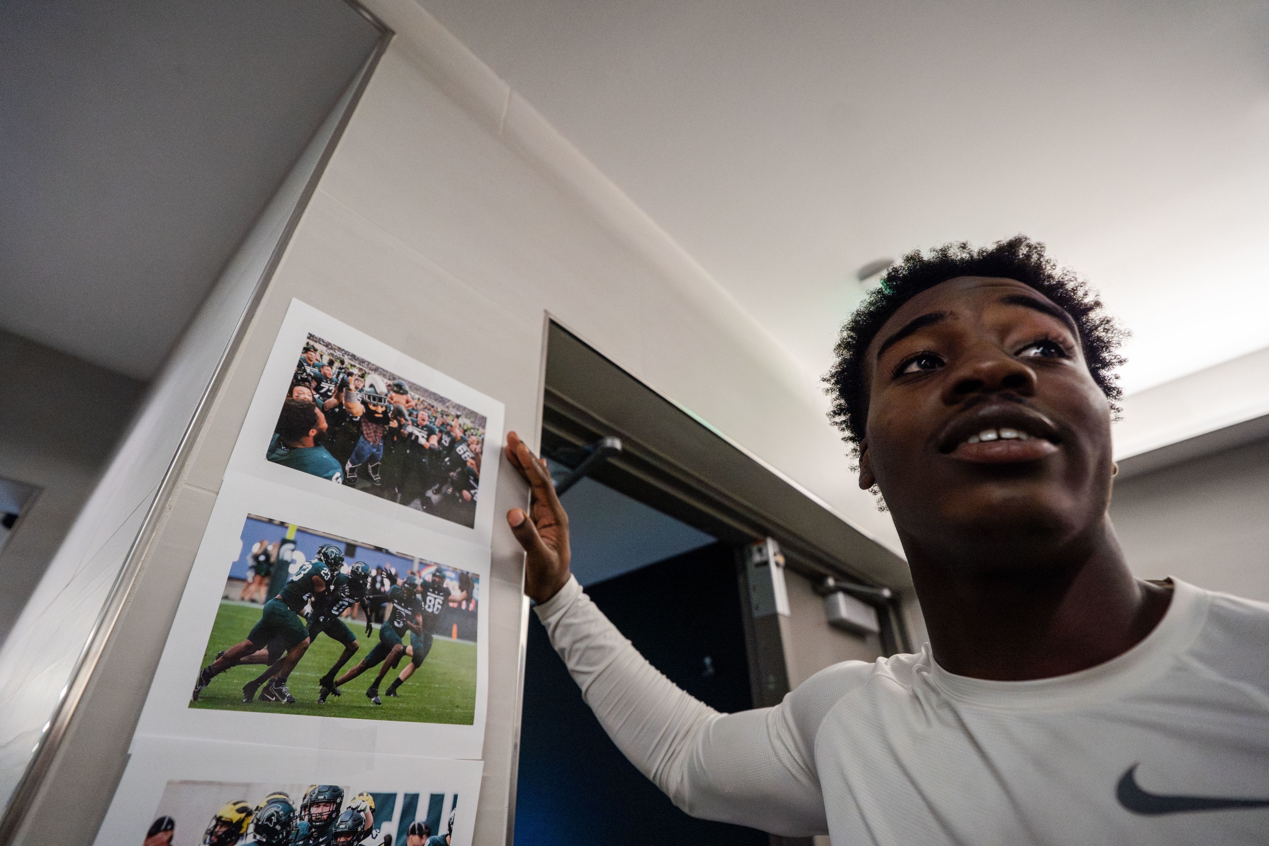 Wide receiver Nick Marsh (6) reacts to the uniforms for the upcoming game against the University of Michigan at the Duffy Daugherty Building on Oct. 24, 2025. For the rivalry game, the equipment staff announced the return of the 2021 uniforms last worn in Michigan State’s most recent win over Michigan.
