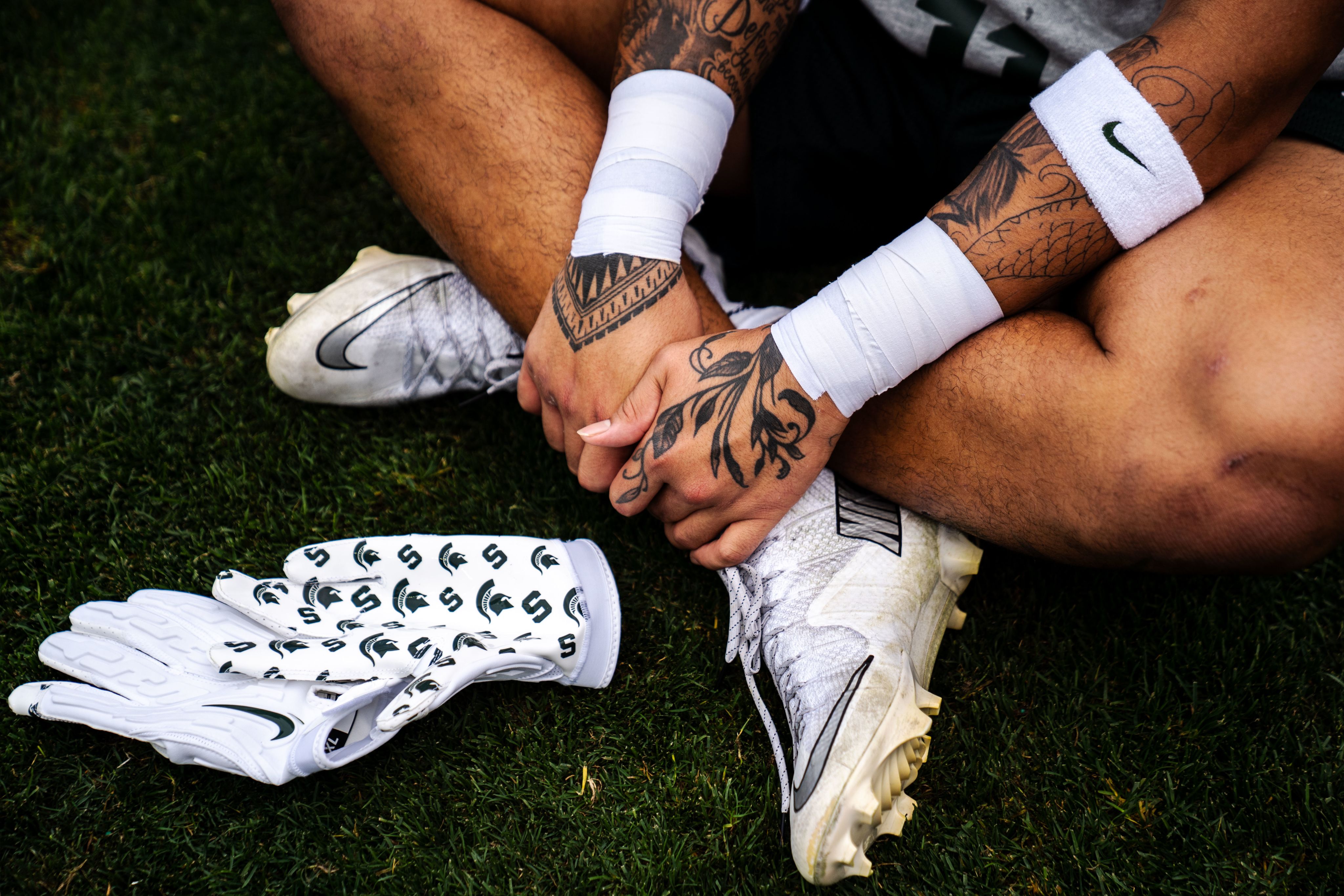 Wide receiver Alante Brown (0) listens to music before the season opener against Western Michigan at Spartan Stadium on Aug. 29, 2025.