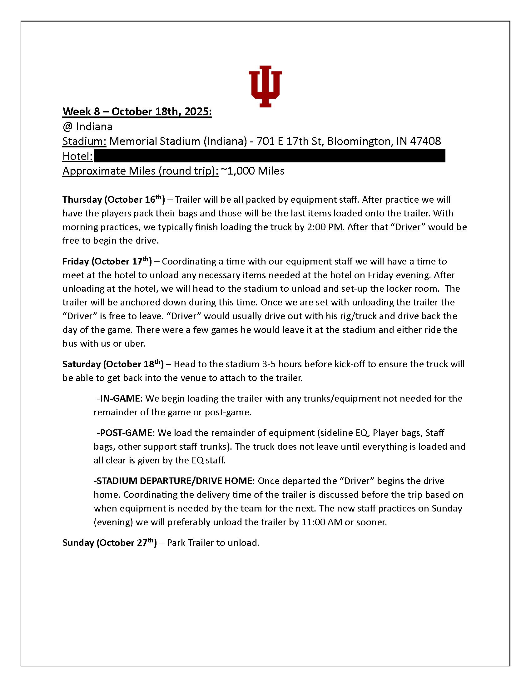 Just because a trip is shorter doesn't mean it's more simple. The 620-mile journey to Indiana follows the same deliberate rhythm, with the truck departing on Thursday and meeting the team at the hotel on Friday before moving to the stadium.