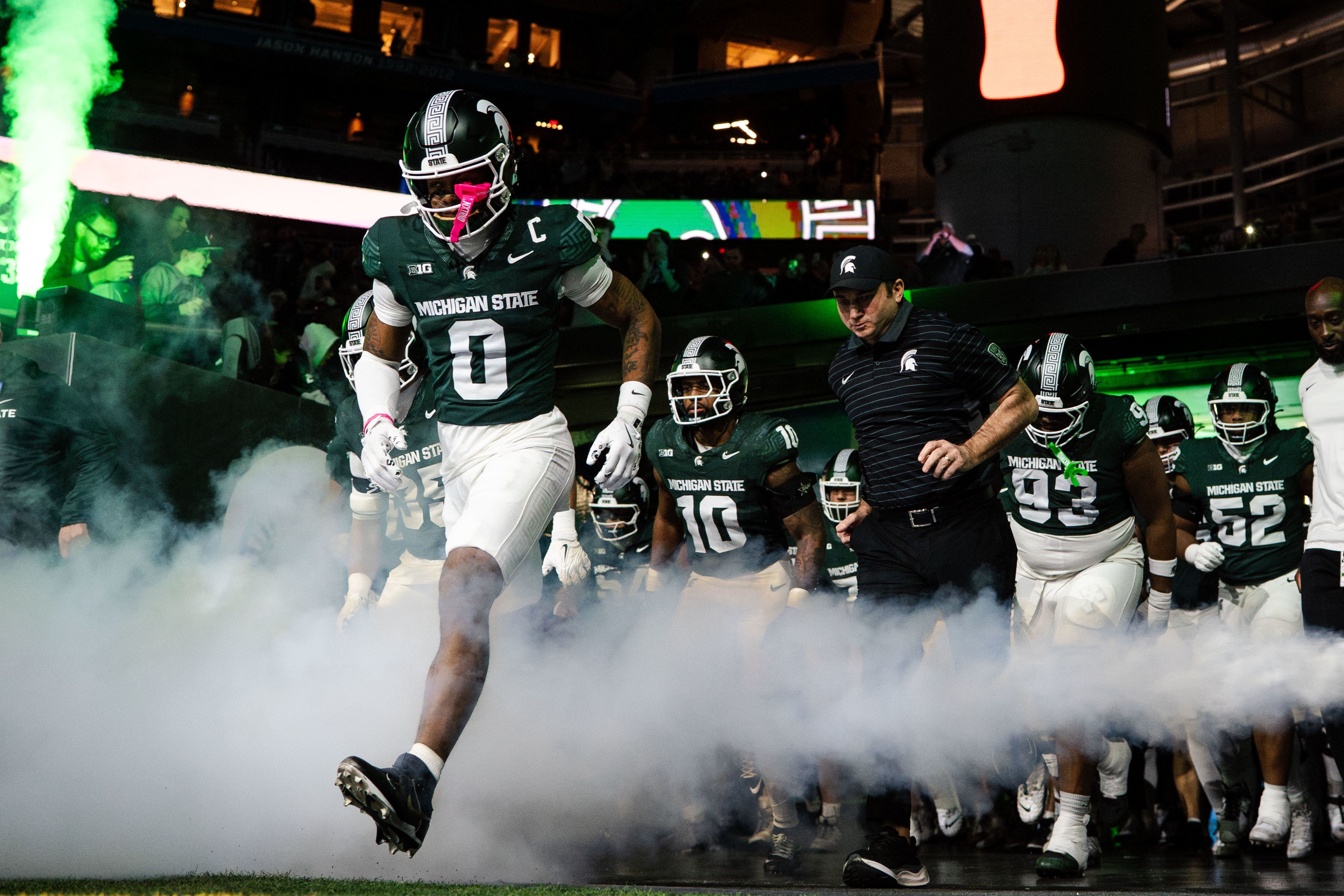 The Michigan State football team runs onto the field with head coach Jonathan Smith before its final game of the season against the University of Maryland at Ford Field on Nov. 29, 2025.