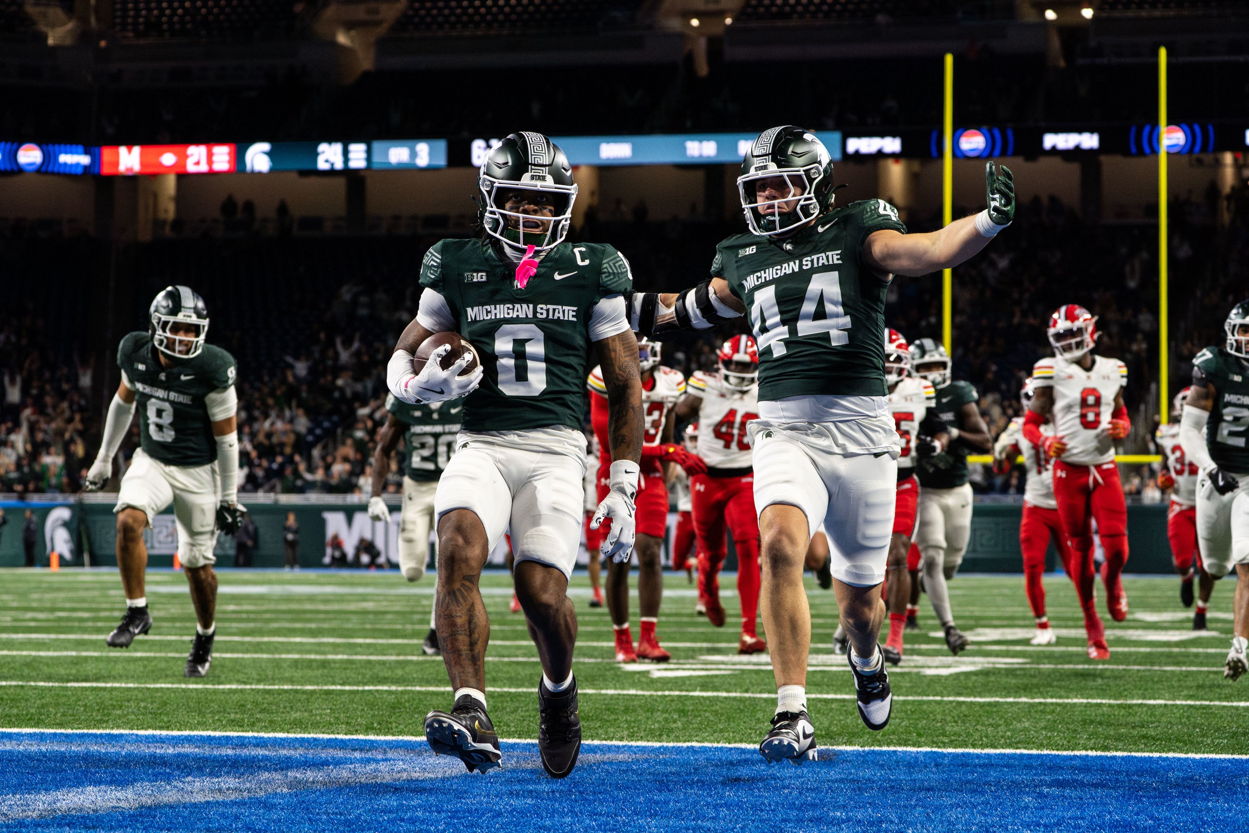 Michigan State wide receiver Alante Brown (0) runs a 92-yard touchdown against the University of Maryland at Ford Field in Detroit on Nov. 29, 2025. Michigan State beat Maryland 38–28 to finish the season 4–8.